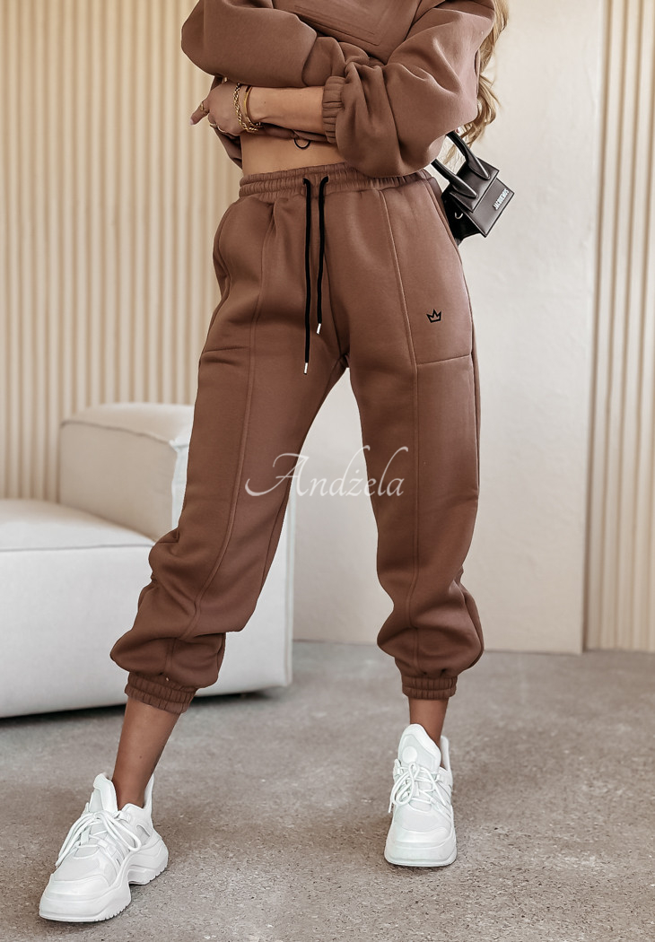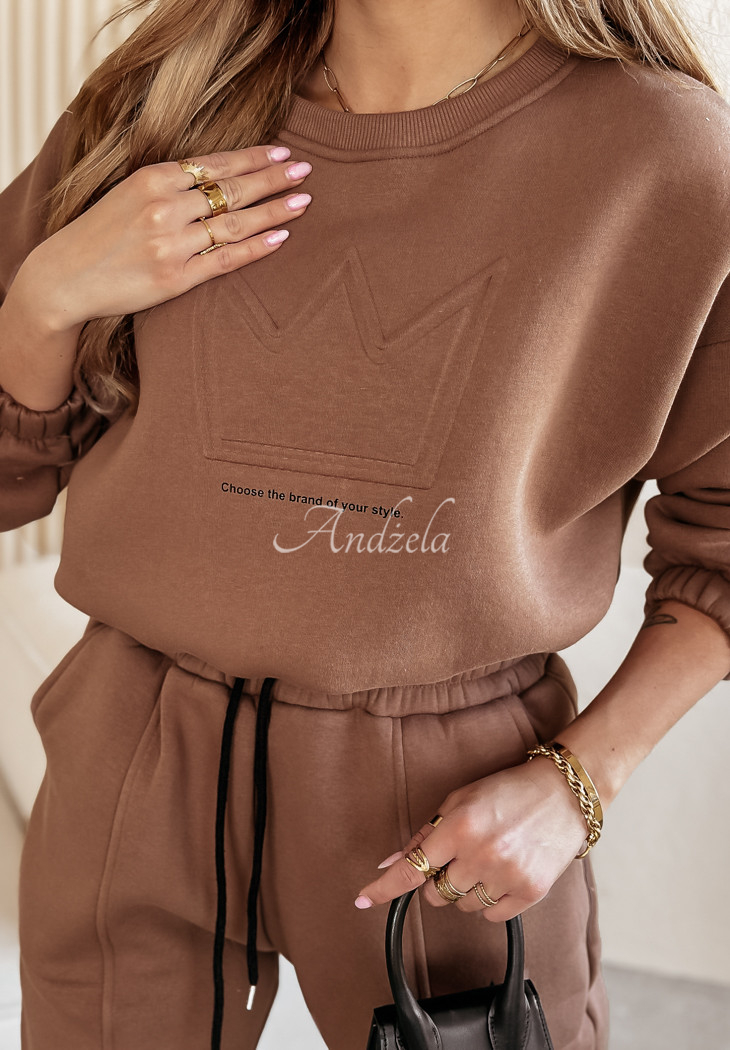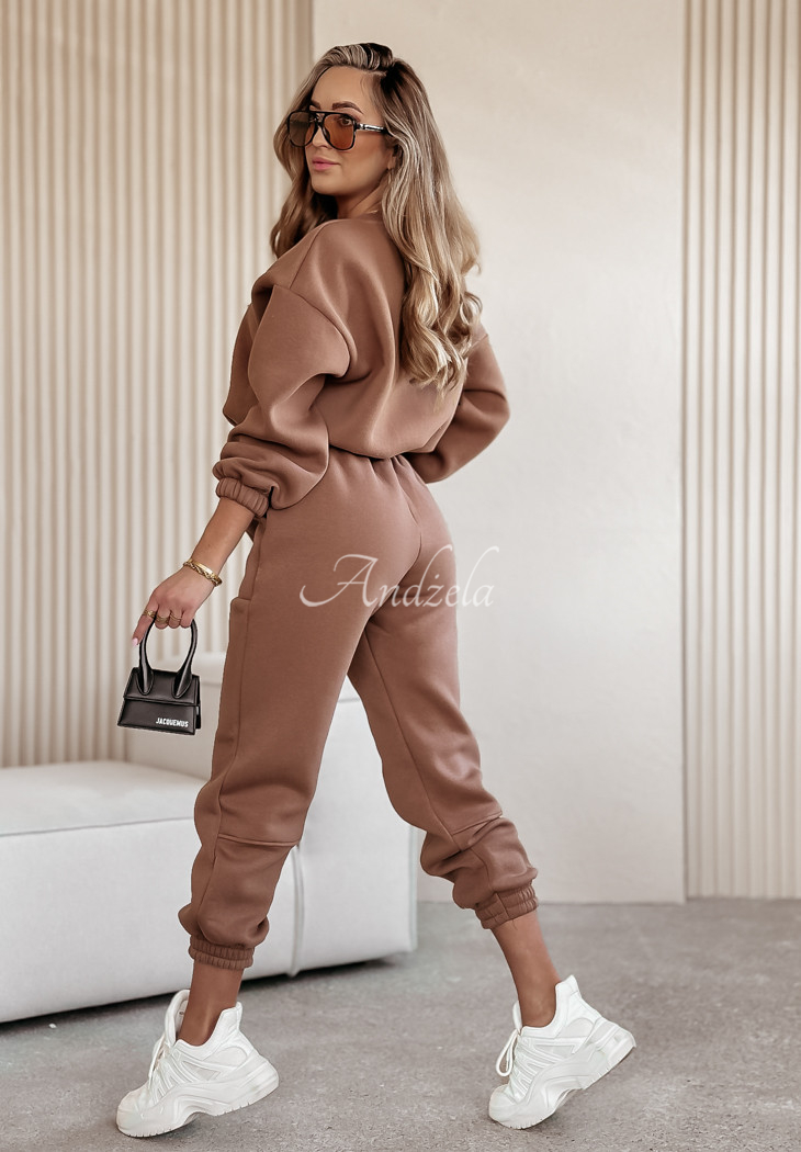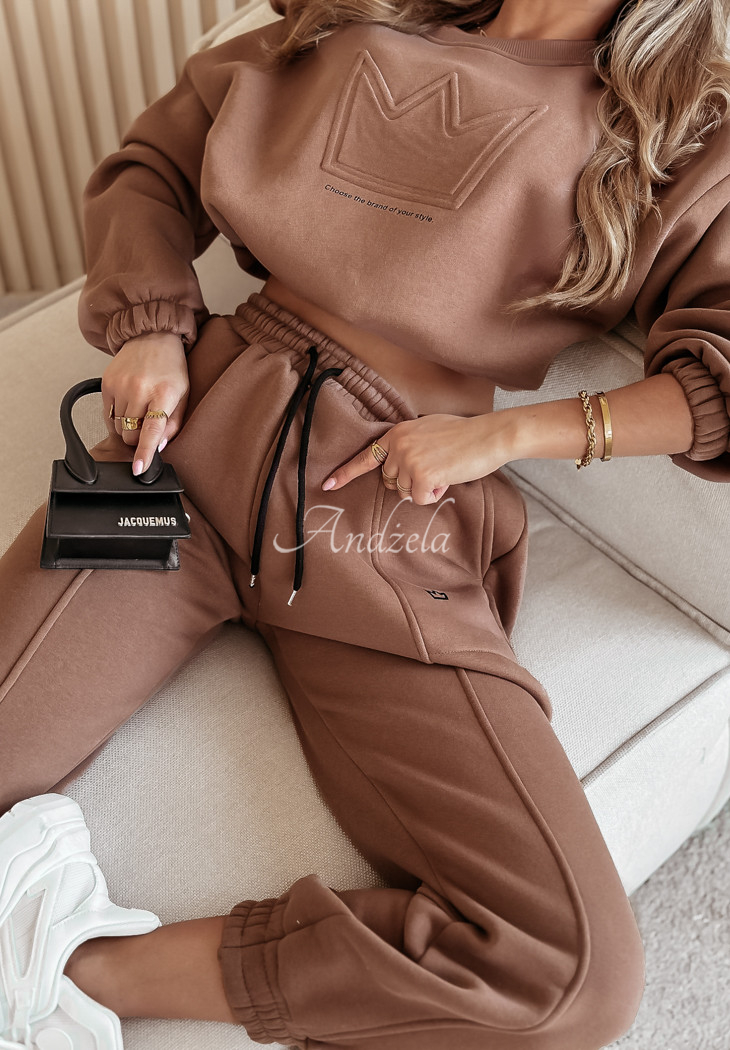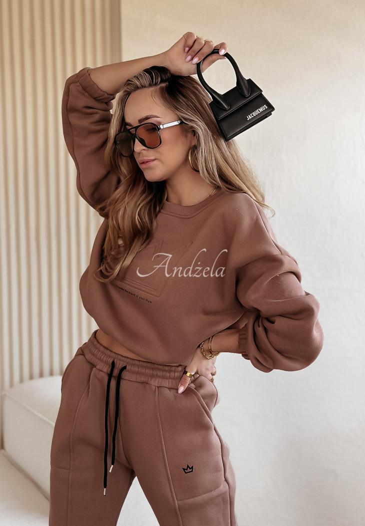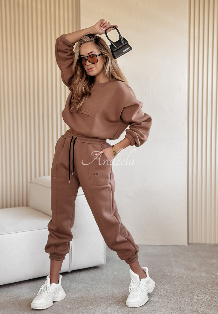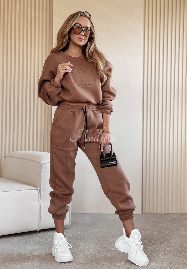 Cotton sweatshirt set is an option created for fashionable yet comfortable loos. The shorter cut sweatshirt is distinguished by an embossed pattern on the front with a minimalist print underneath. Its long sleeves and hem are finished with ribbed cuffs. The pants are a model with pockets on the front and an elastic waistband, thanks to which they fit perfectly to the figure. The whole is insulated, so it will be perfect for colder days.