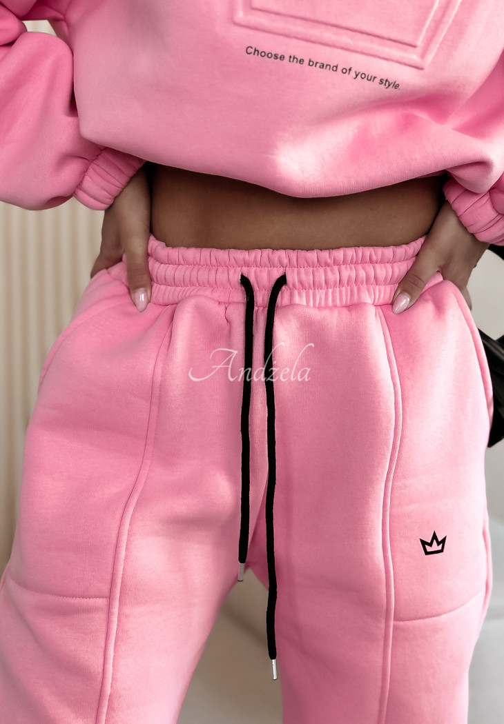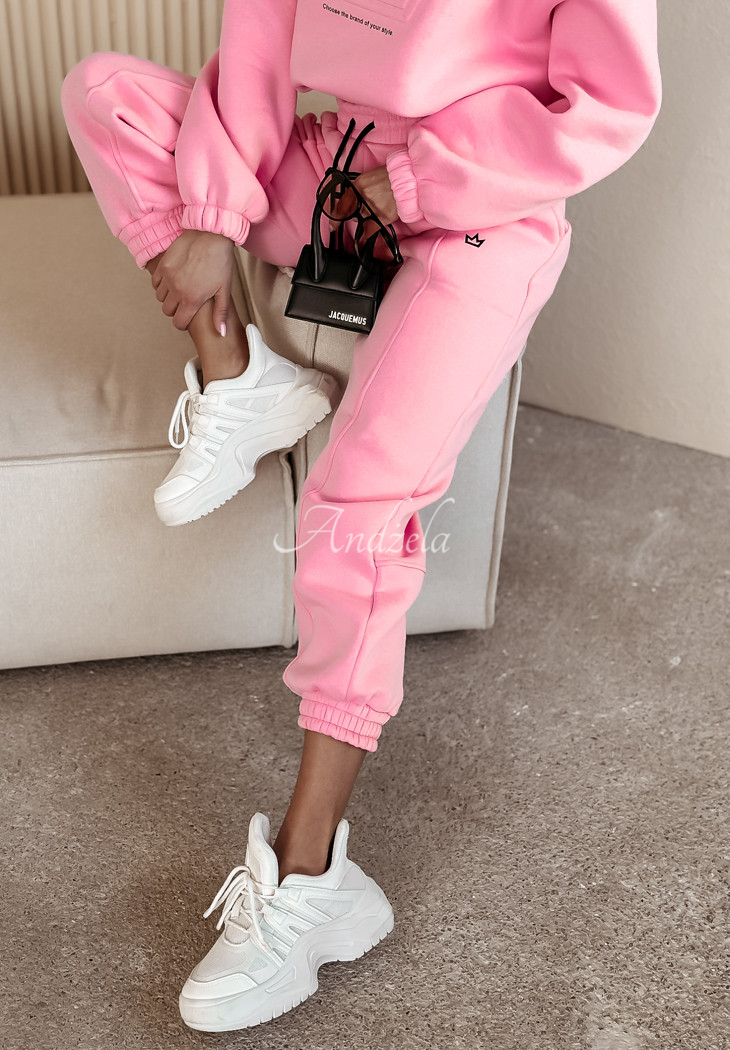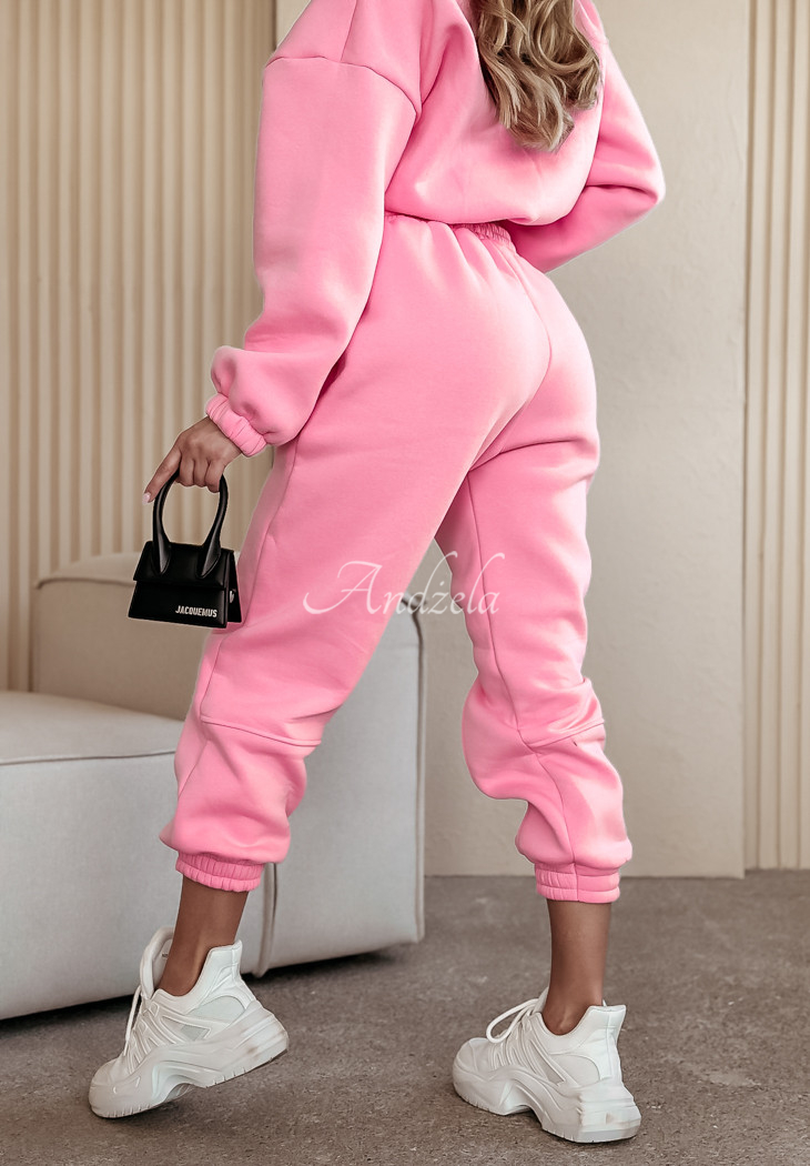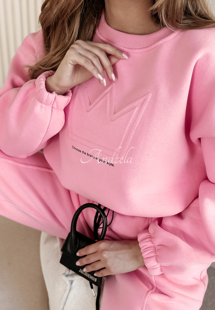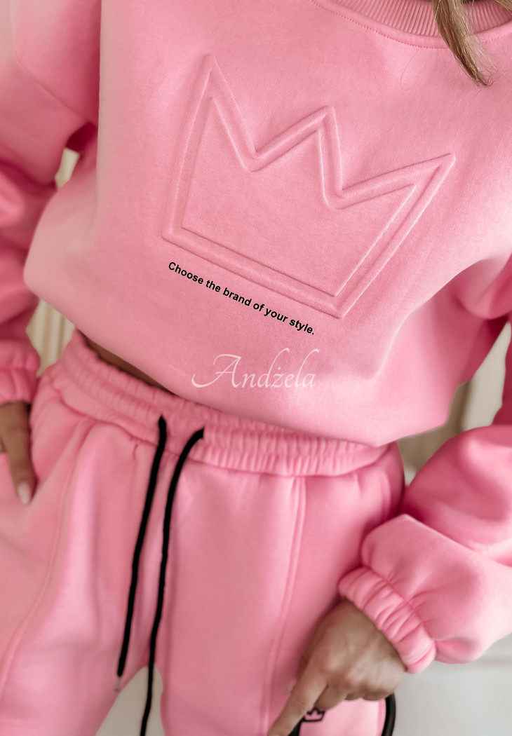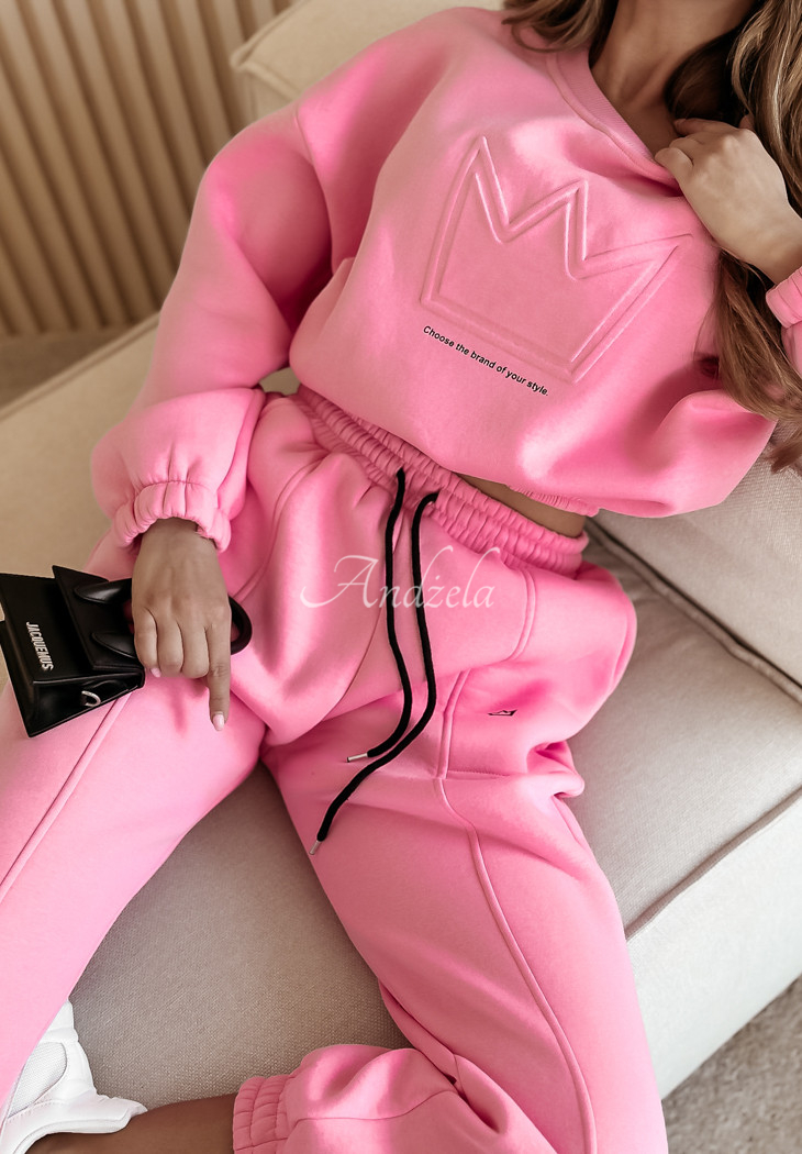 Cotton sweatshirt set is an option created for fashionable yet comfortable loos. The shorter cut sweatshirt is distinguished by an embossed pattern on the front with a minimalist print underneath. Its long sleeves and hem are finished with ribbed cuffs. The pants are a model with pockets on the front and an elastic waistband, thanks to which they fit perfectly to the figure. The whole is insulated, so it will be perfect for colder days.