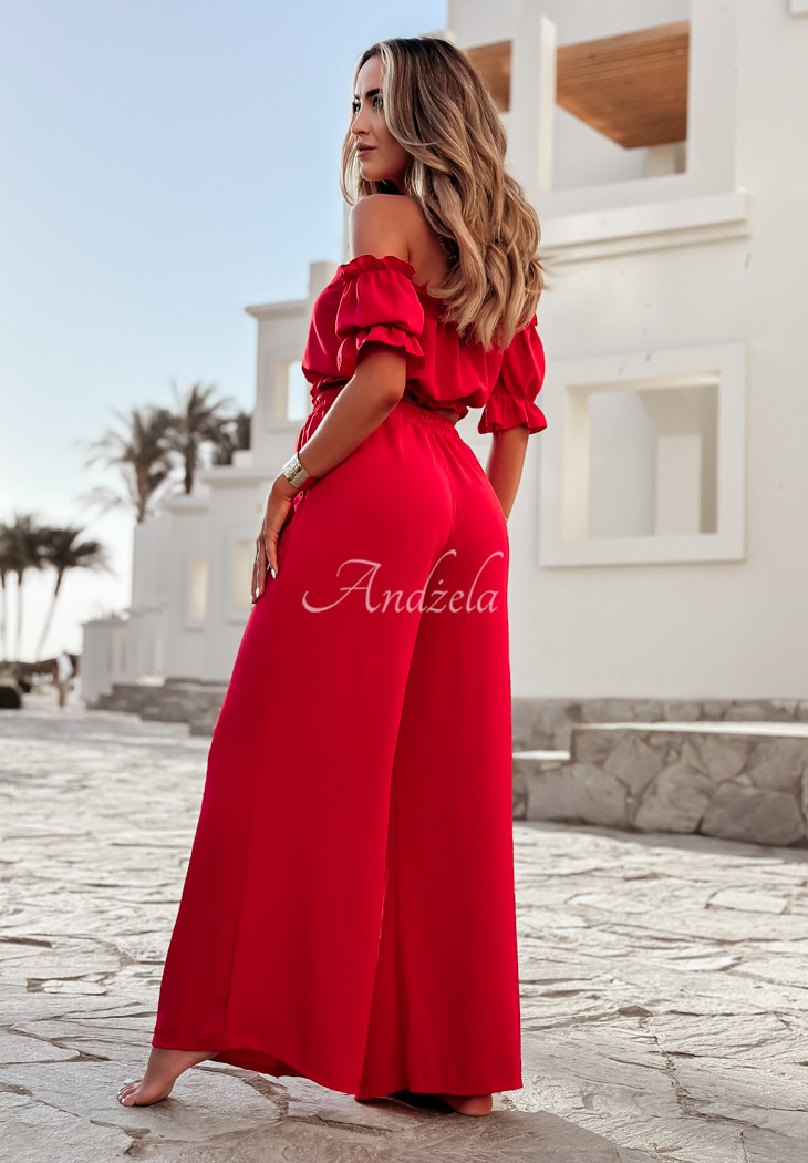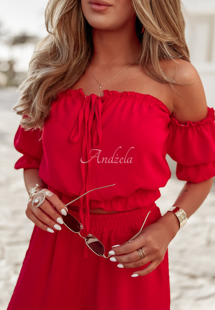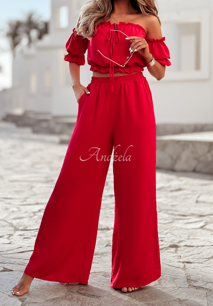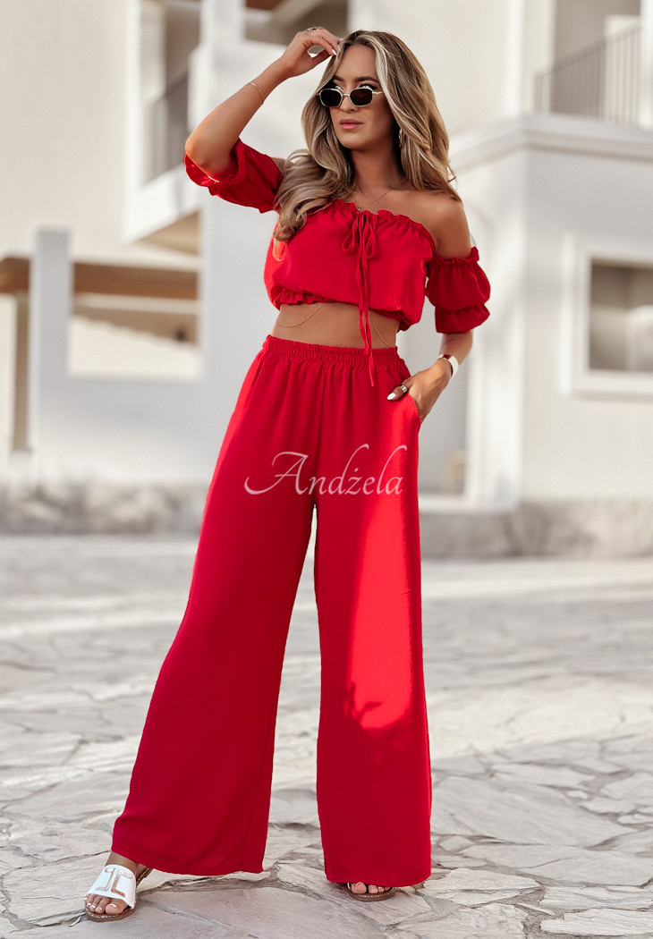 A set made of delicate, airy fabric is an excellent choice as a base for many looks. The blouse with elastic bands at the shoulders and at the bottom has short sleeves with ribbed cuffs and a tie at the neckline. The wide-leg pants have pockets on the side, and there is a sewn-in elastic waistband. Available in several color versions.