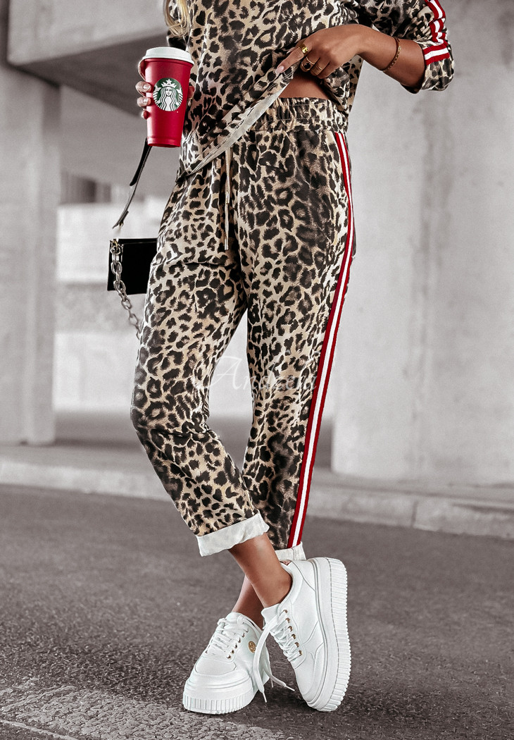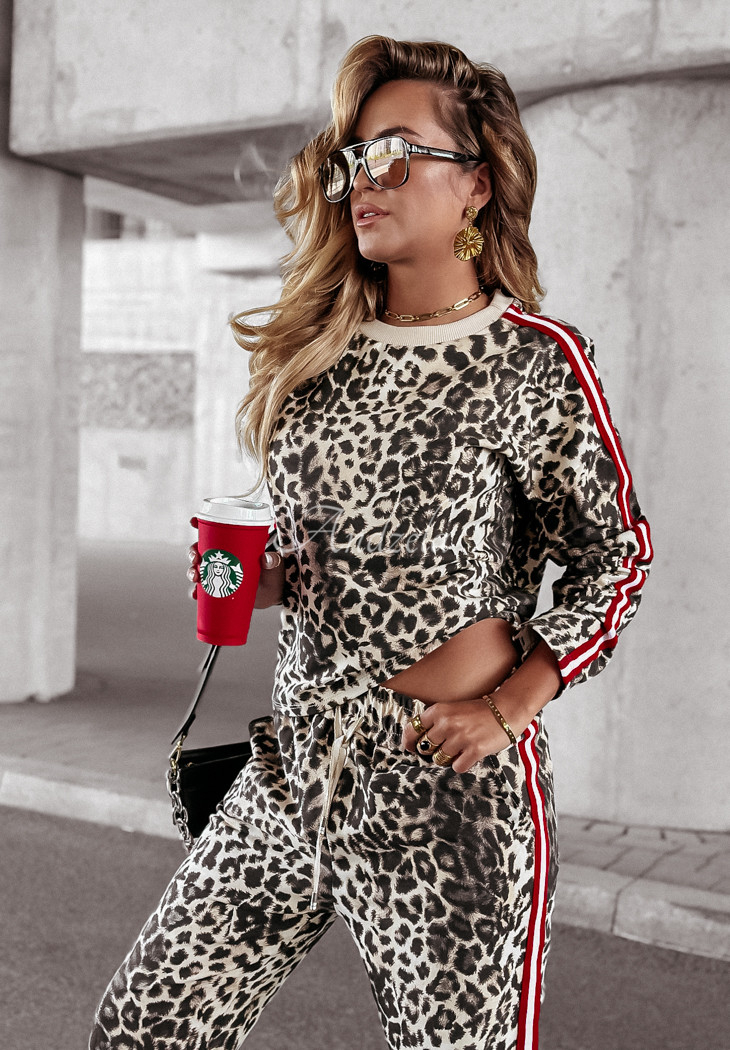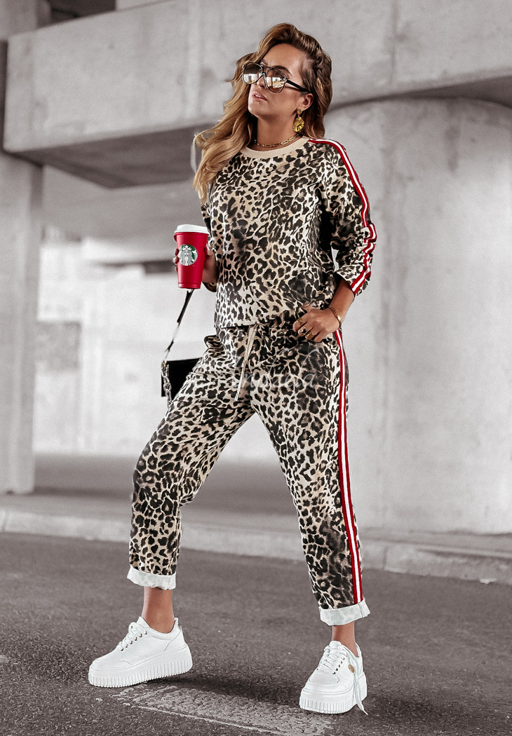 Cotton tracksuit set is a great choice for everyday looks with character. It is distinguished by contrasting stripes, which perfectly complement the whole and give it an interesting look. The sweatshirt with a classic cut has long sleeves and a rounded neckline. The pants are a model with functional pockets, as well as an elastic band with a drawstring waist, thanks to which they fit perfectly to the silhouette. This set should be in the closet of every woman who opts for comfortable, yet fashionable solutions.