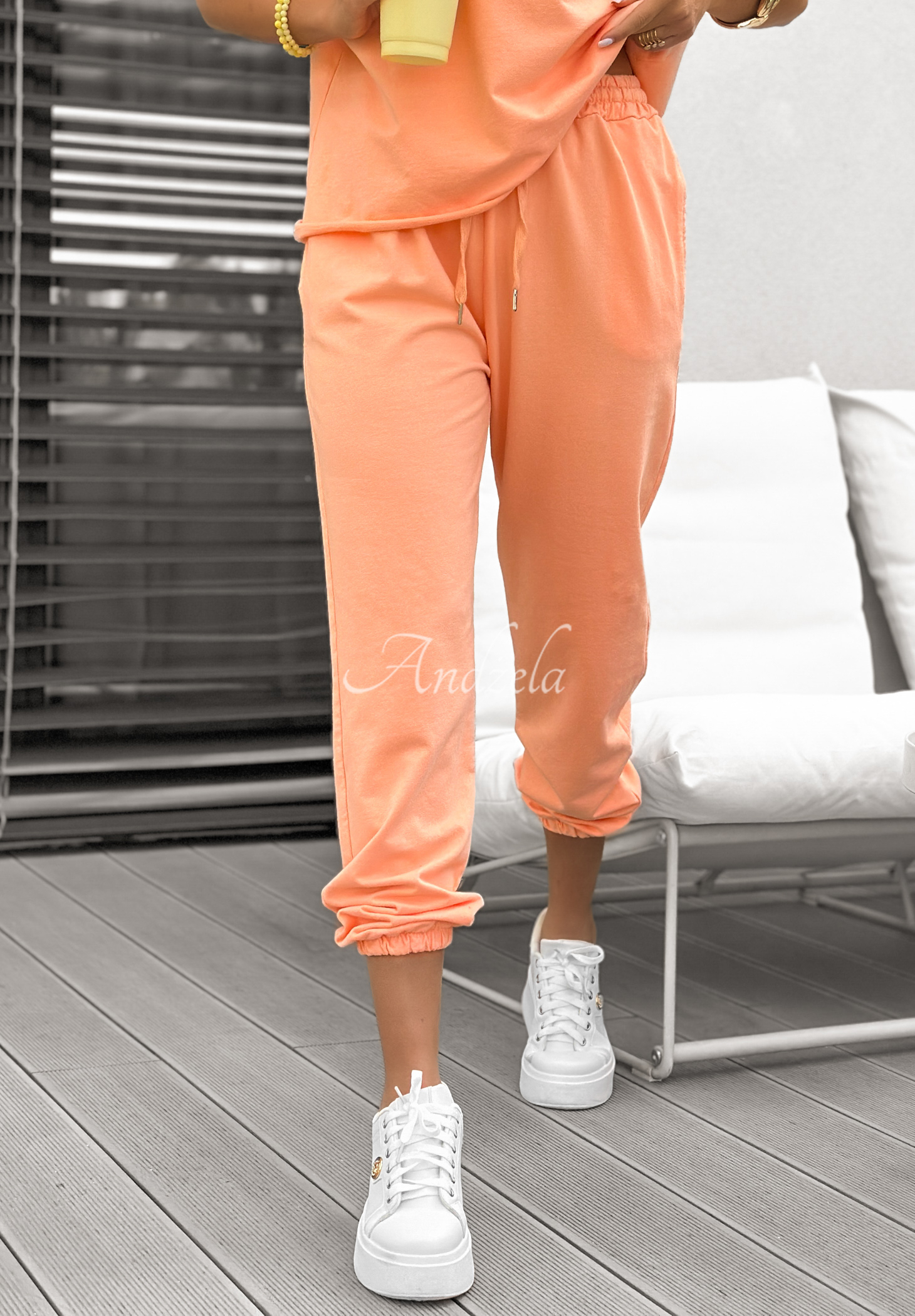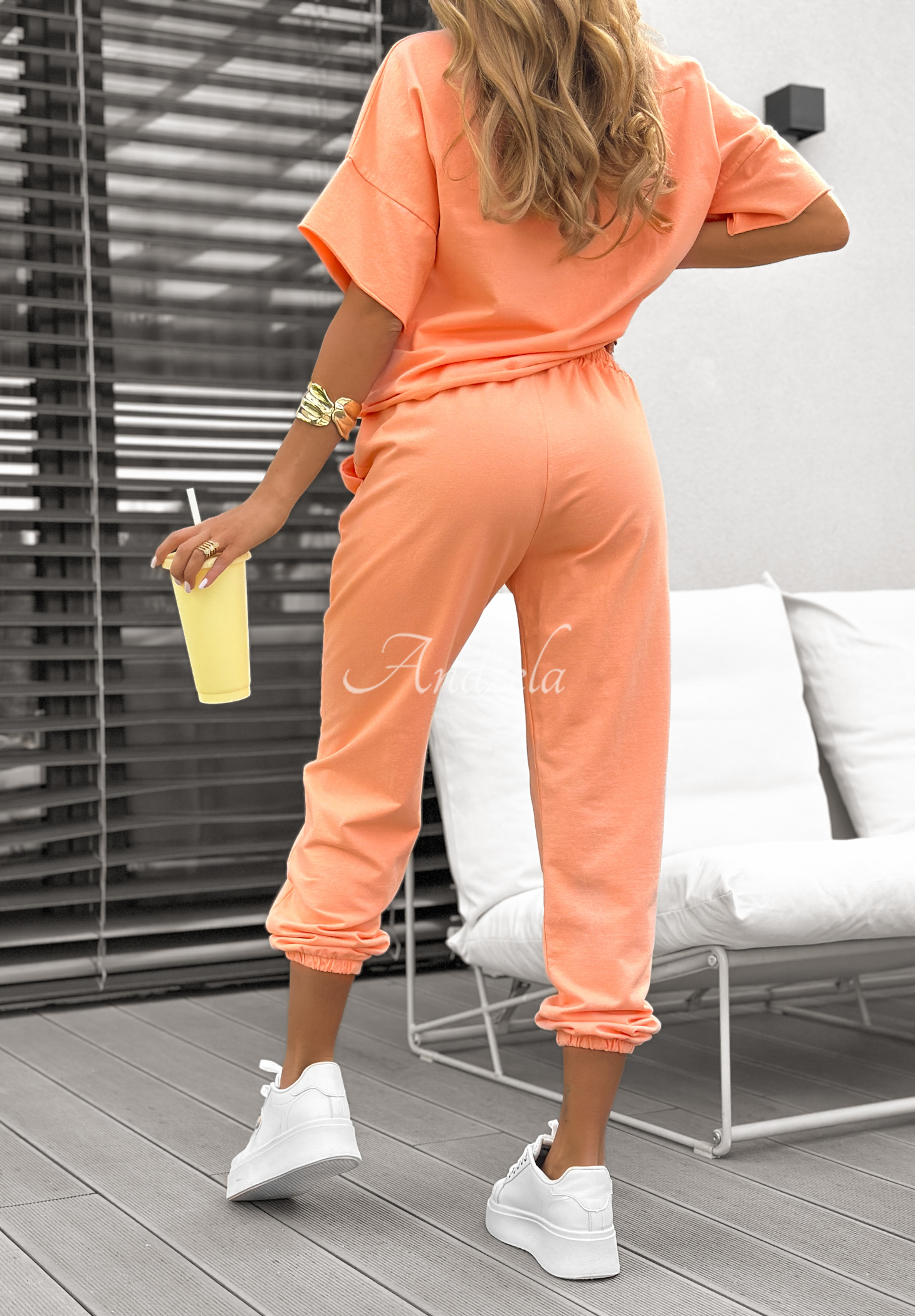 The tracksuit set is made of high-quality cotton material. The T-shirt is an oversize cut model with a rounded neckline and short sleeves. Pants of classic cut with a high waist, have functional pockets. They feature an elastic waistband with drawstring.