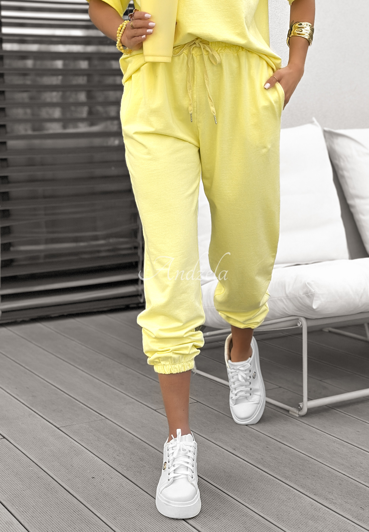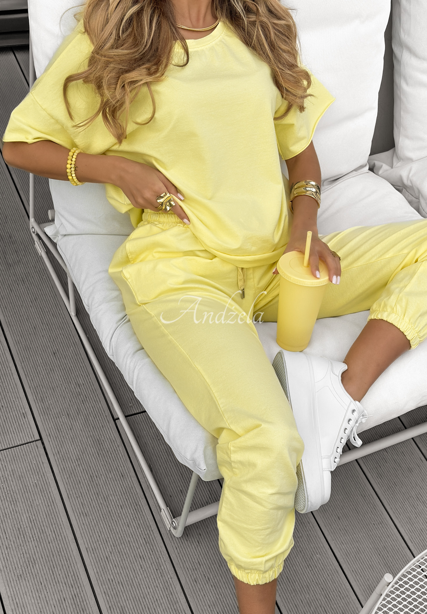 The tracksuit set is made of high-quality cotton material. The T-shirt is an oversize cut model with a rounded neckline and short sleeves. Pants of classic cut with a high waist, have functional pockets. They feature an elastic waistband with drawstring.