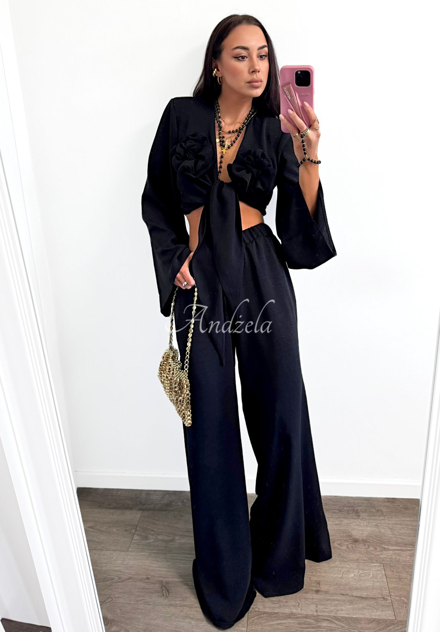 Viscose set made of pleasant, lightweight material is a perfect choice for summer days! The tied shirt is distinguished by decorative flowers at the bust. It has shoulder pads and wide sleeves. The pants are a wide leg model with an elastic waistband and functional pockets on the front.