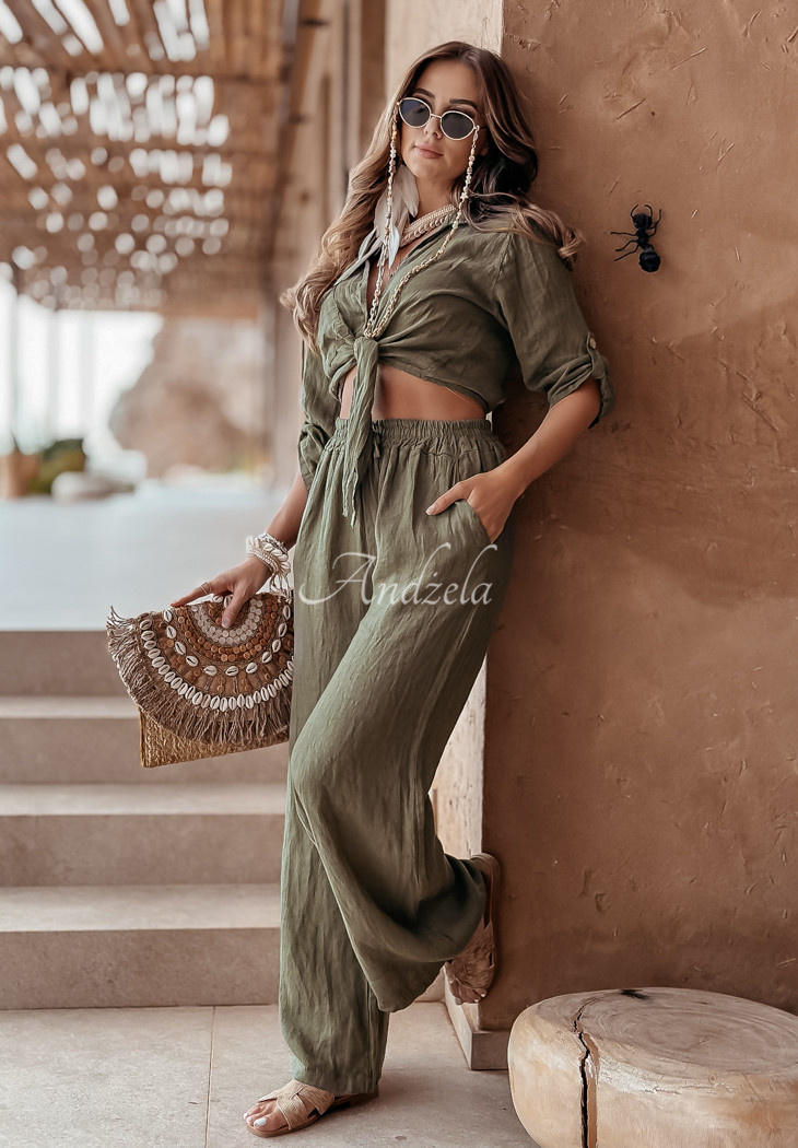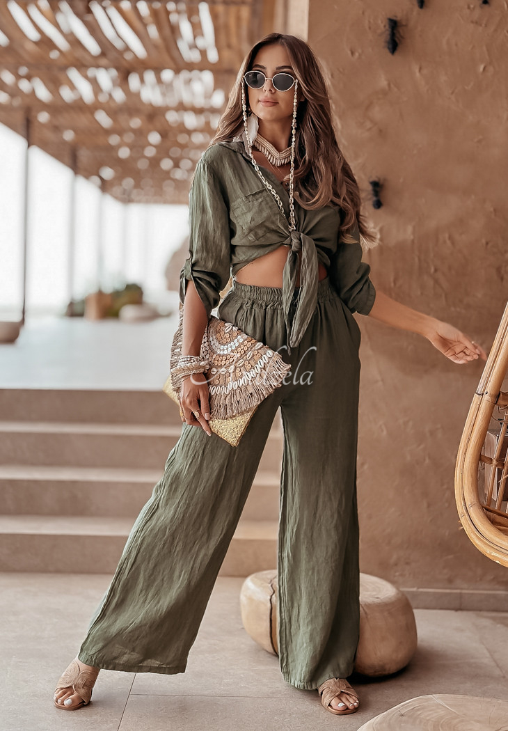 Short shirt made of high-quality linen fabric. It is buttoned, has sleeves that are gently adjustable in length and ties at the front. At the height of the bust there is a pocket. This proposition will be perfect for any summer closet and will fit perfectly into everyday looks.