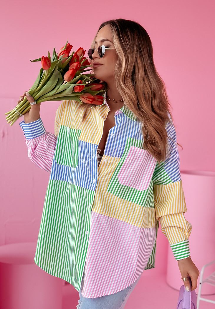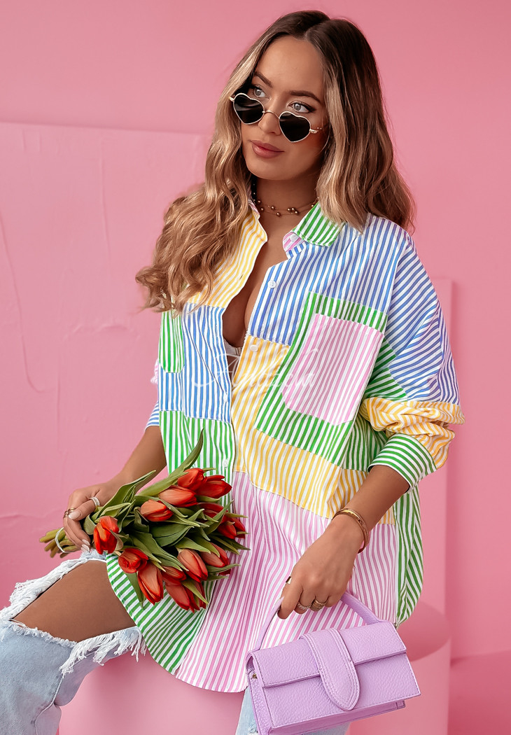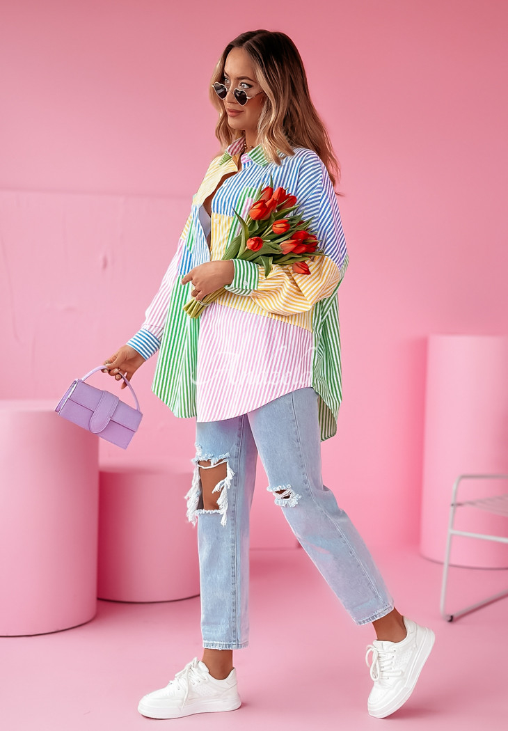 The striped shirt is a great base for everyday looks. The gently asymmetrical model with an oversized cut, is buttoned. The sleeves are finished with cuffs. This proposal will phenomenally compose when combined with matching leggings or jeans.
