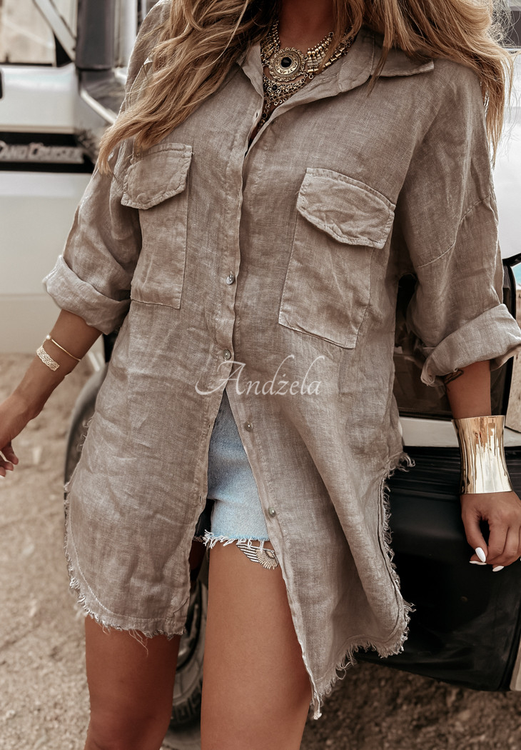 A long shirt made of high-quality linen fabric is a great choice for everyday wear in the summer season. It is a model with a collar, button closure and lowered shoulder line. It is distinguished by a raw-edged, slightly frayed bottom. There are two functional pockets on the front. Shirt from the Take A Trip series, choose from other available products and create the perfect styling.