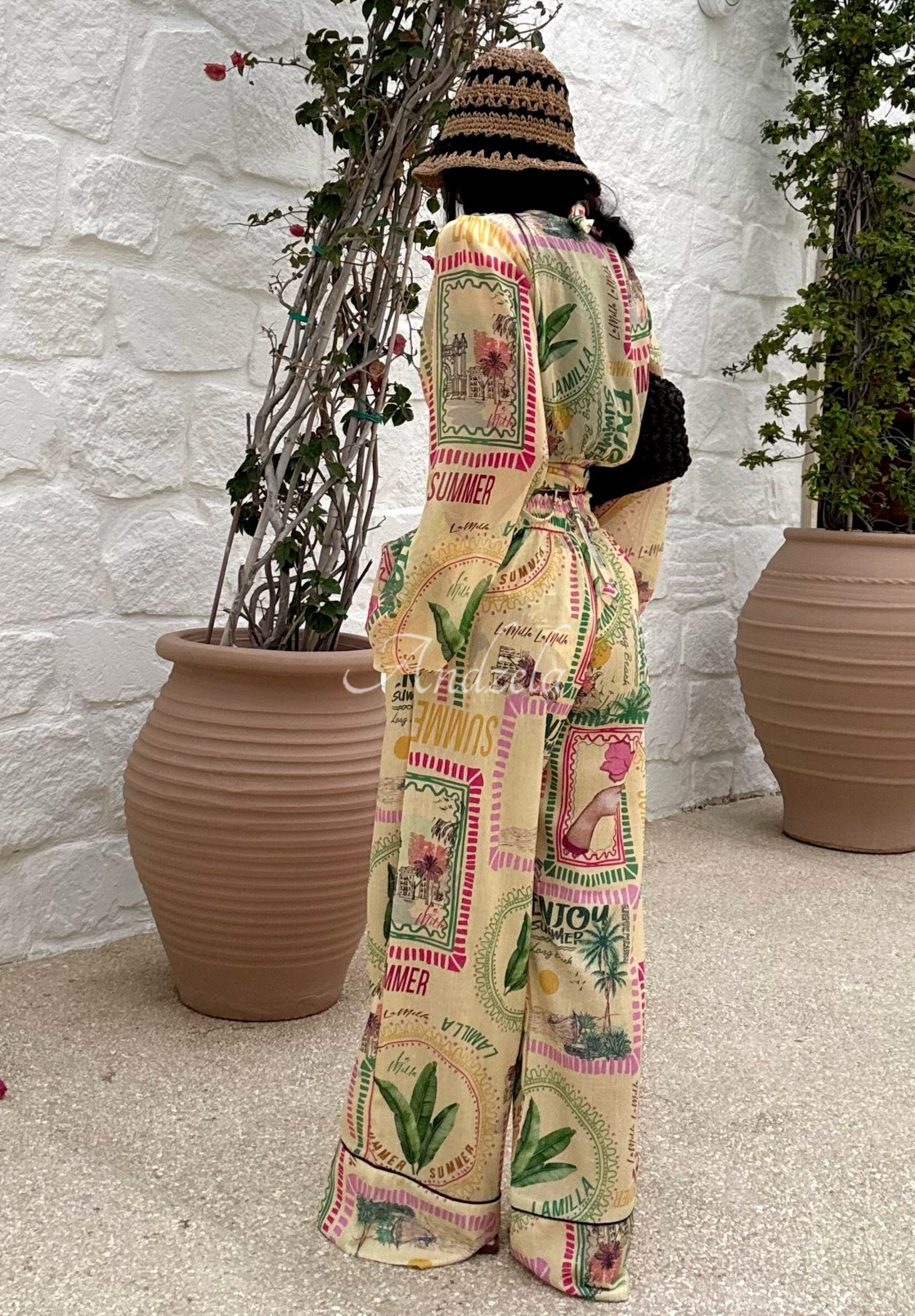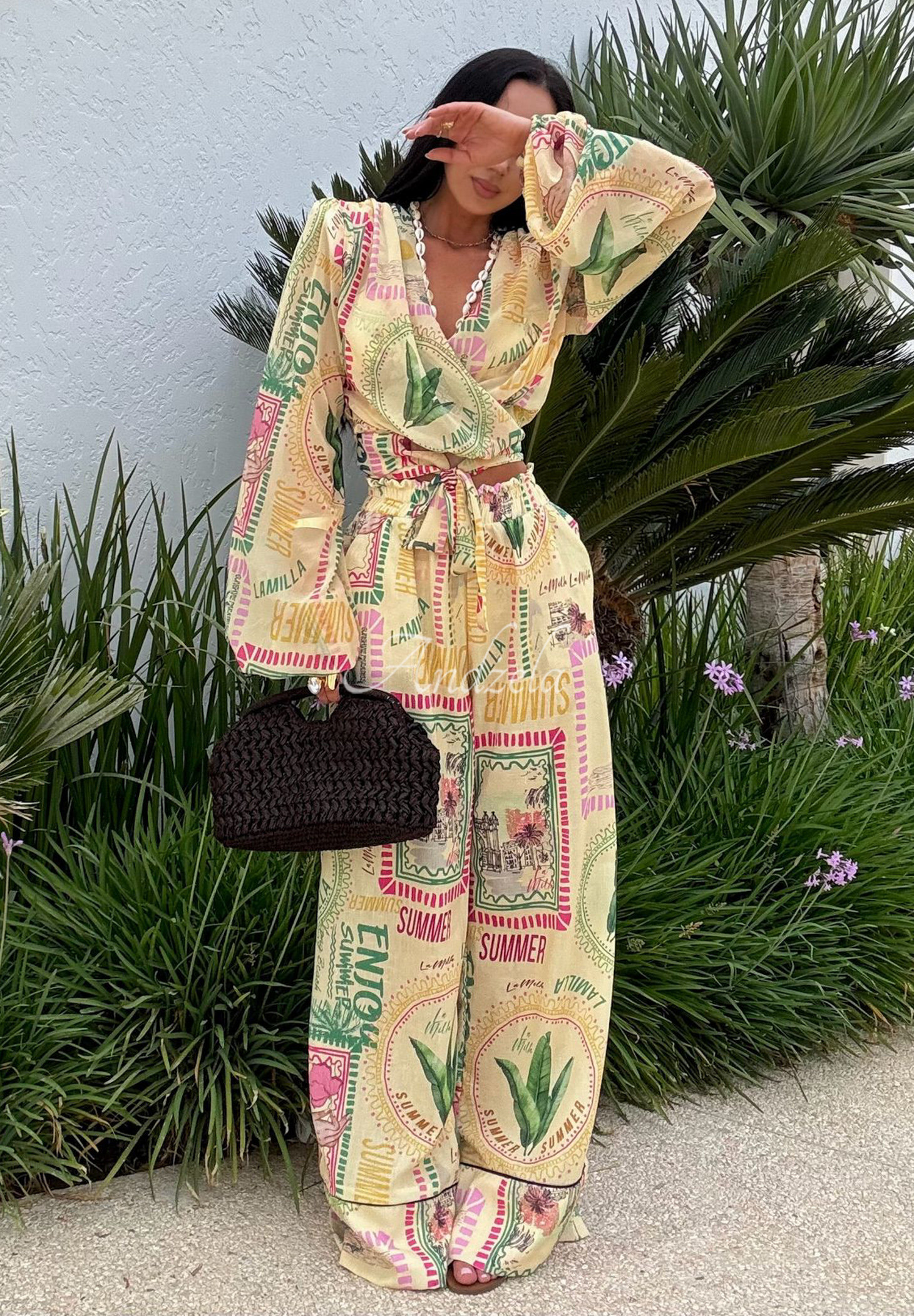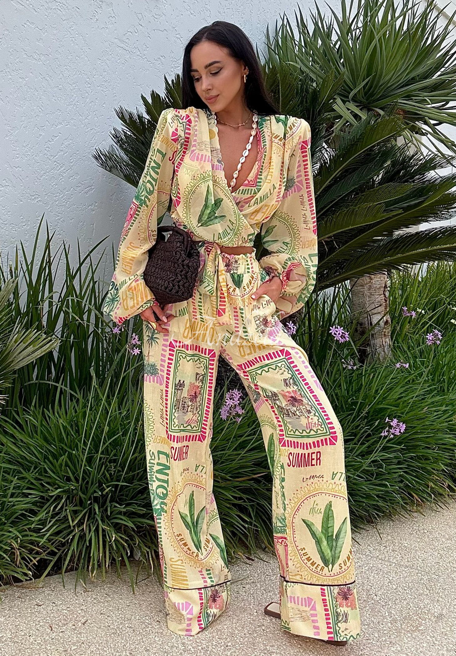 Patterned shirt made of high-quality viscose fabric. The model with an envelope neckline is distinguished by binding at the bottom. The proposal has sewn-in shoulder pads and long sleeves finished with welts.