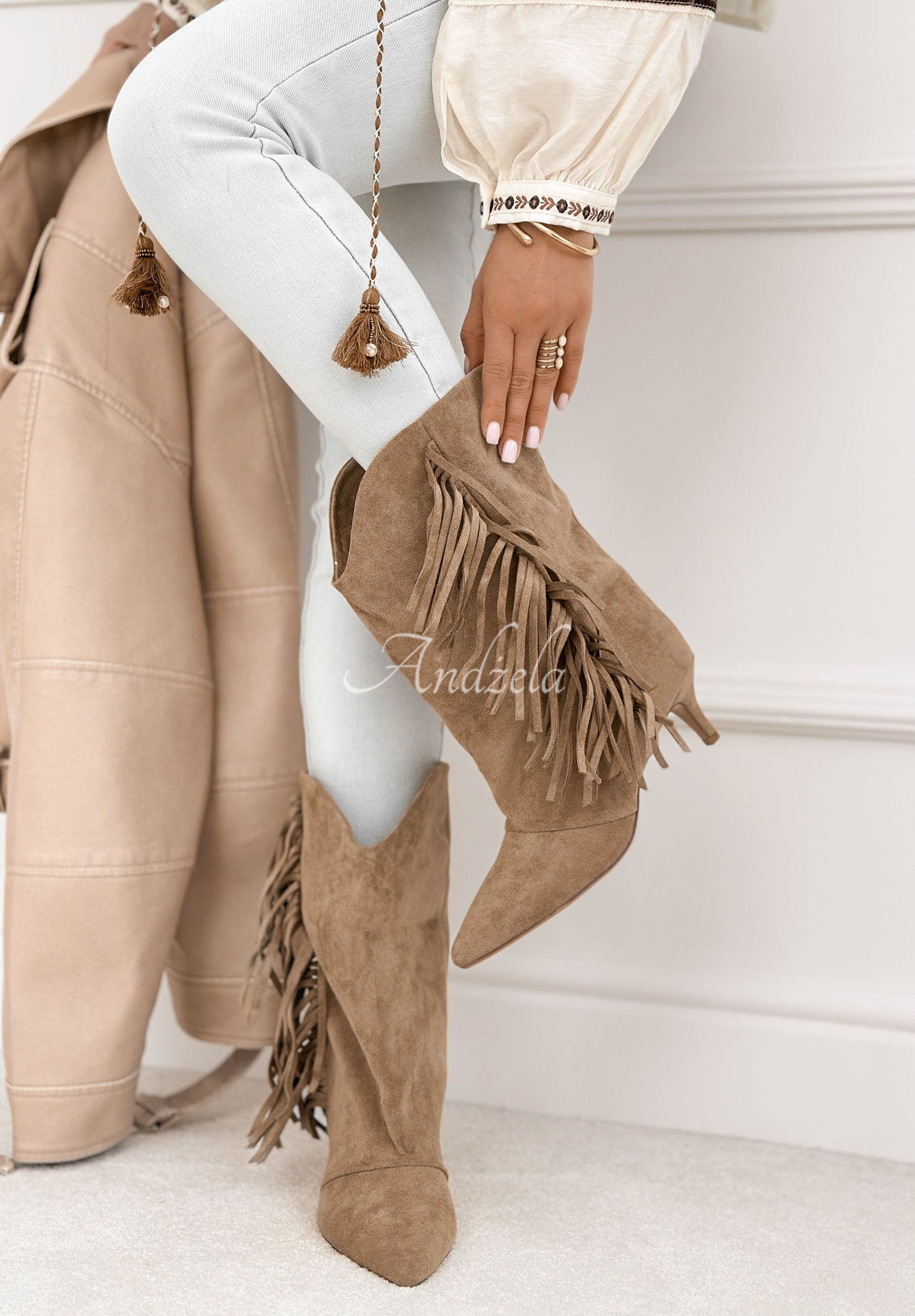 Suede ankle boots with a lower heel and decorative fringes. This is an unfastened model with a pointed toe and light insulation.