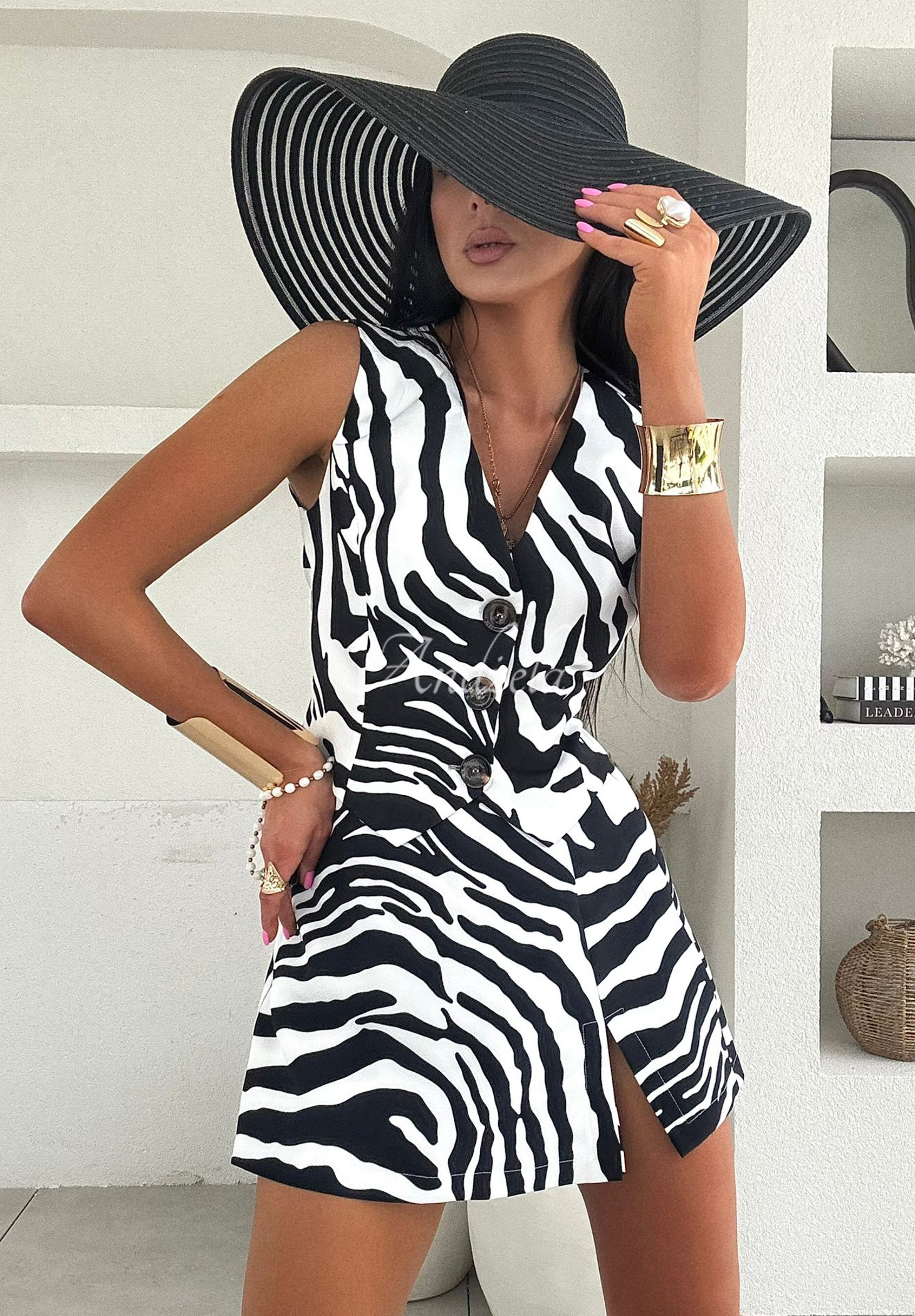 Material skirt-shorts in a fashionable pattern are a great choice for looks for various outings. It is a mini length model with a subtle slit in the front. It fastens with a zipper located on the side.