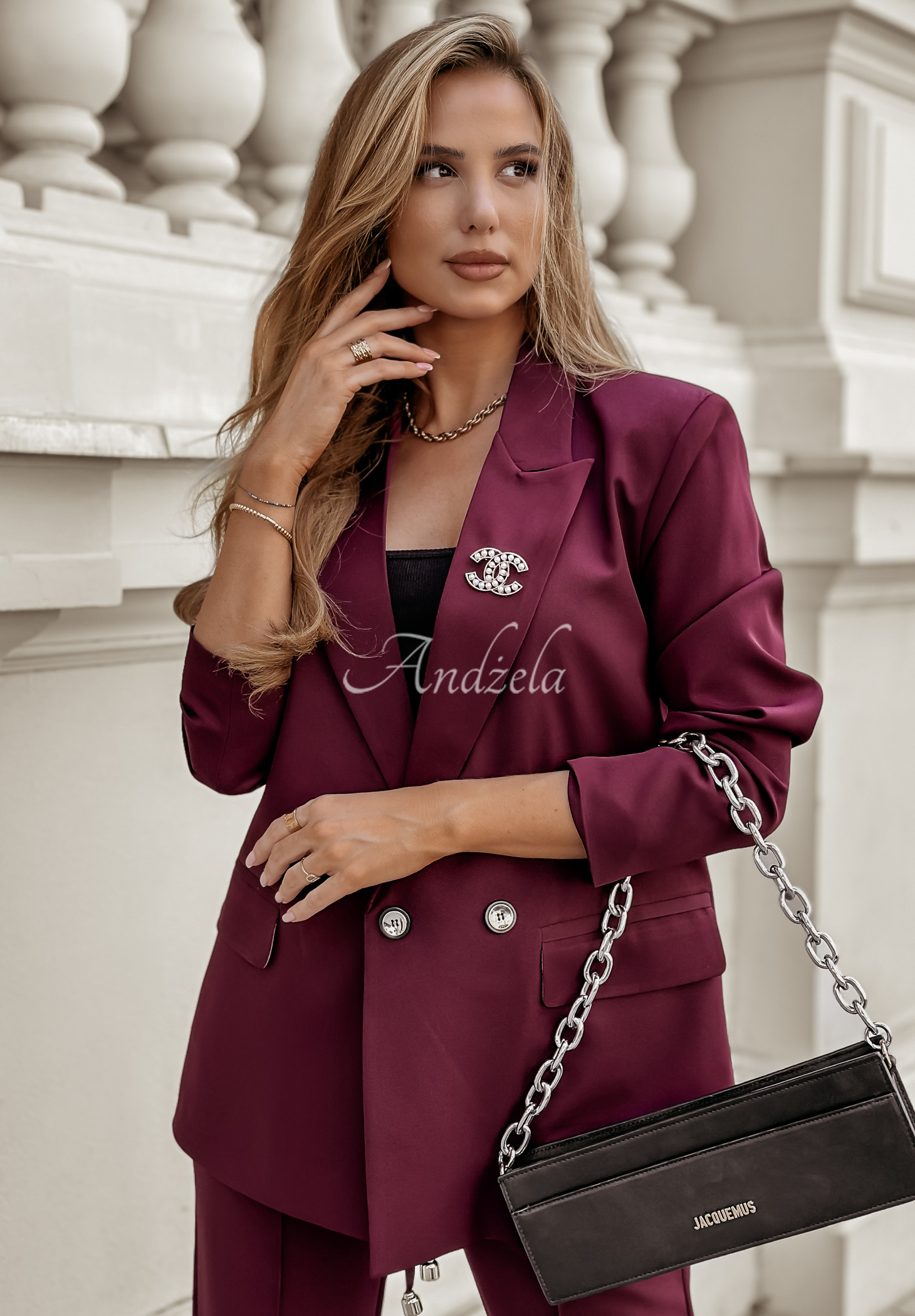 A classic blazer is an indispensable part of any closet! Fastened with two horizontal buttons, it has a collar, as well as functional pockets. It is a model with a lining and long sleeves, on the shoulders there are shaping pads. The whole is completed with gold details. This proposition will work in many stylings, both elegant and everyday.