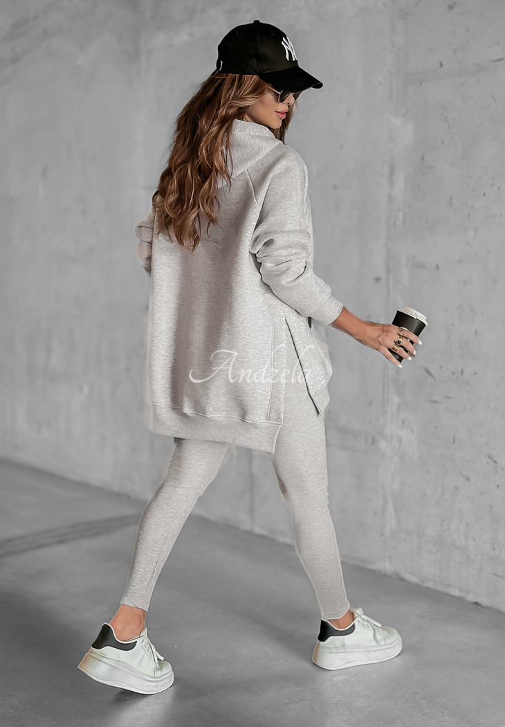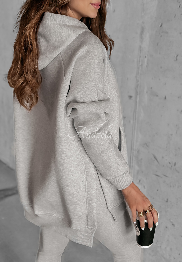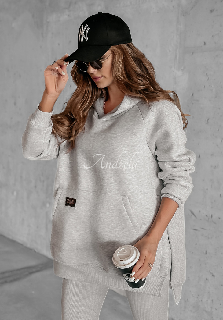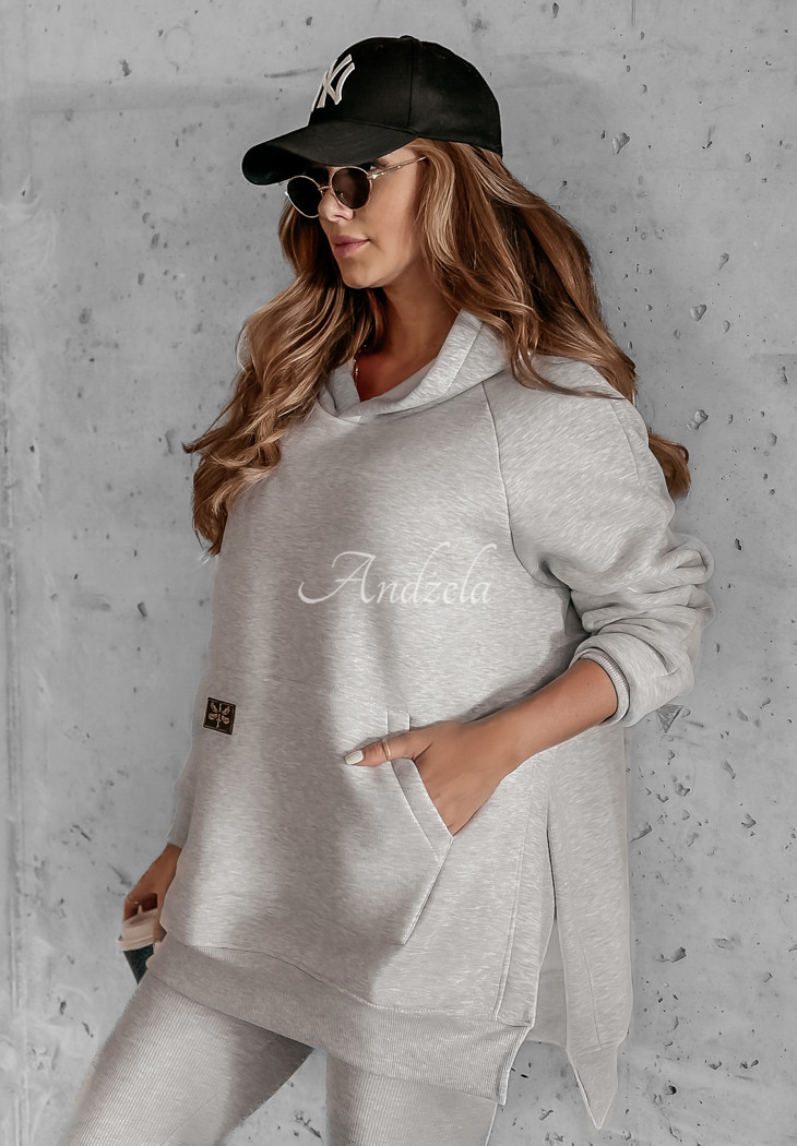 A warmed sweatshirt, distinguished by slits on the sides, will be perfect for cold days. Oversized model, has a hood, as well as a kangaroo pocket. The sleeves and hem are finished with welts. This proposal will be best presented in a comfortable way, paired with leggings. The product is available in many color variants.