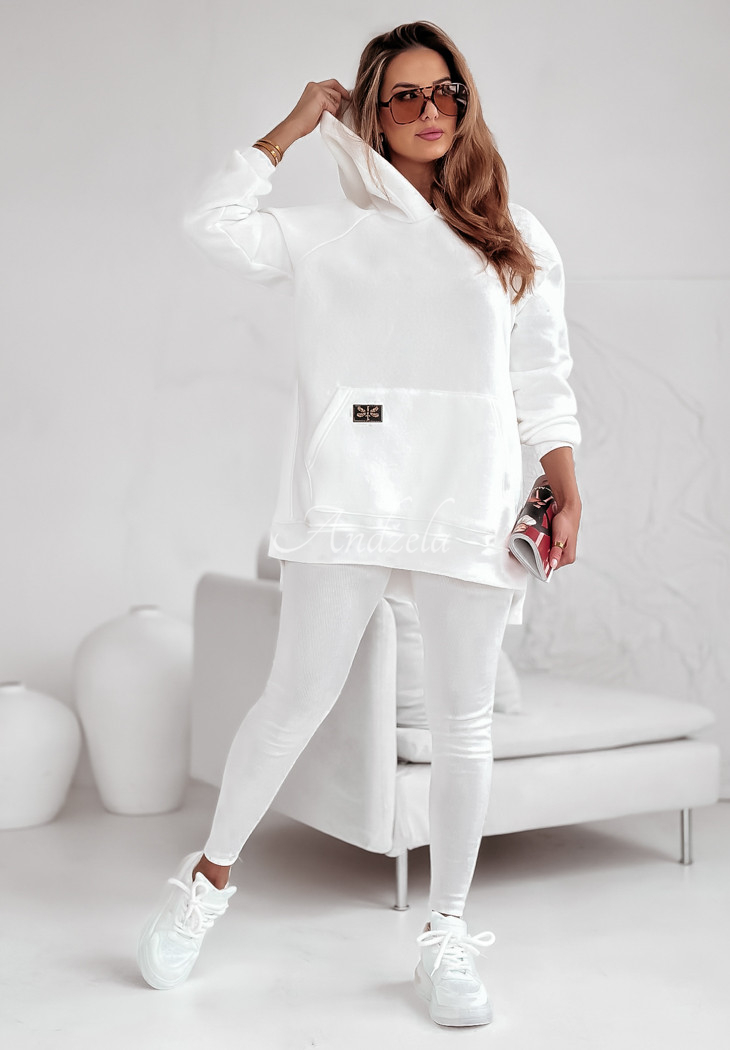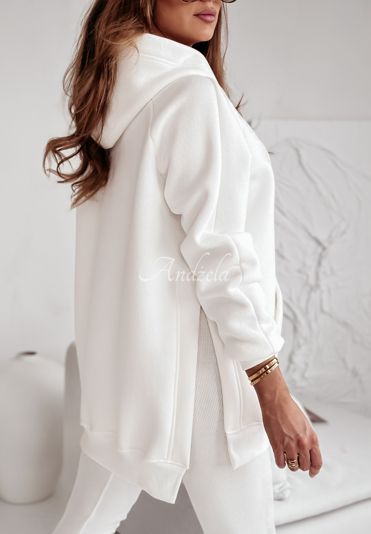 A warmed sweatshirt, distinguished by slits on the sides, will be perfect for cold days. Oversized model, has a hood, as well as a kangaroo pocket. The sleeves and hem are finished with welts. This proposal will be best presented in a comfortable way, paired with leggings. The product is available in many color variants.