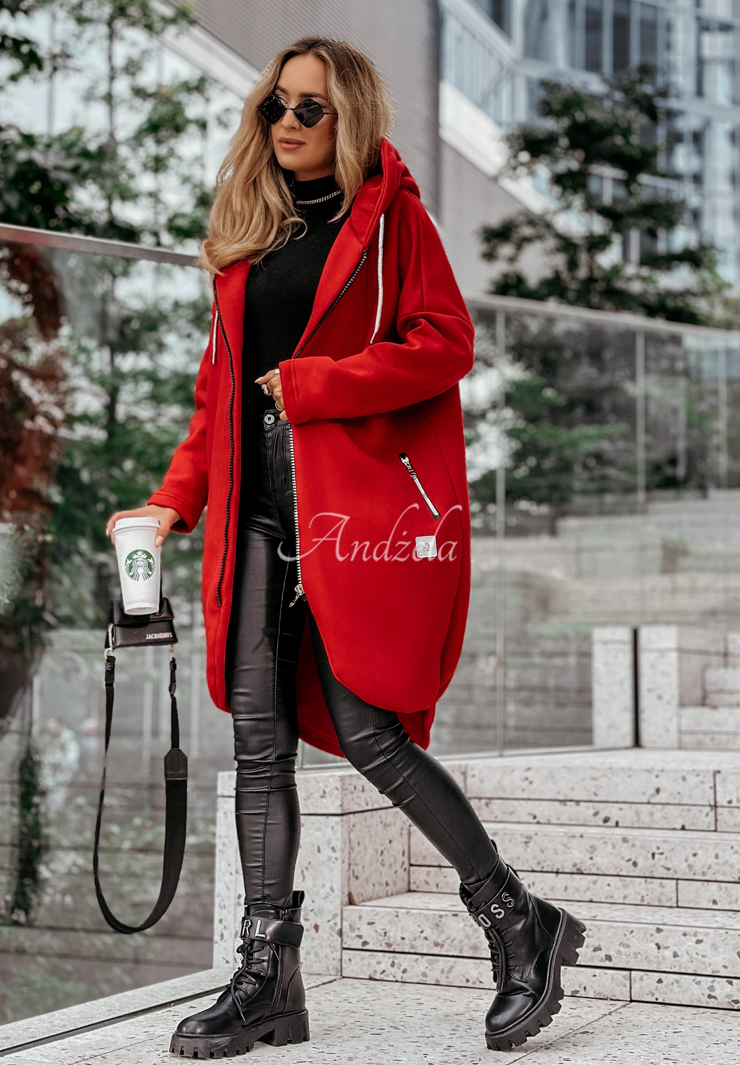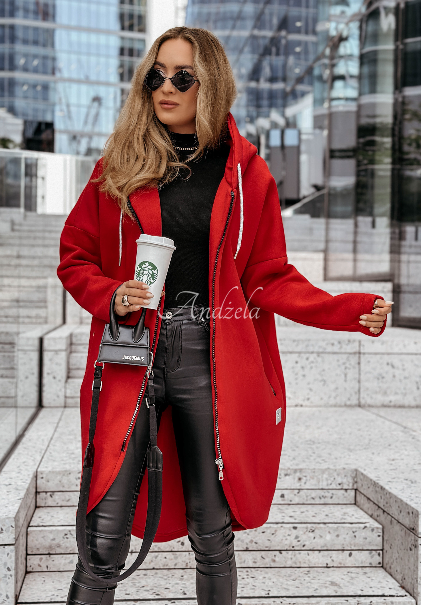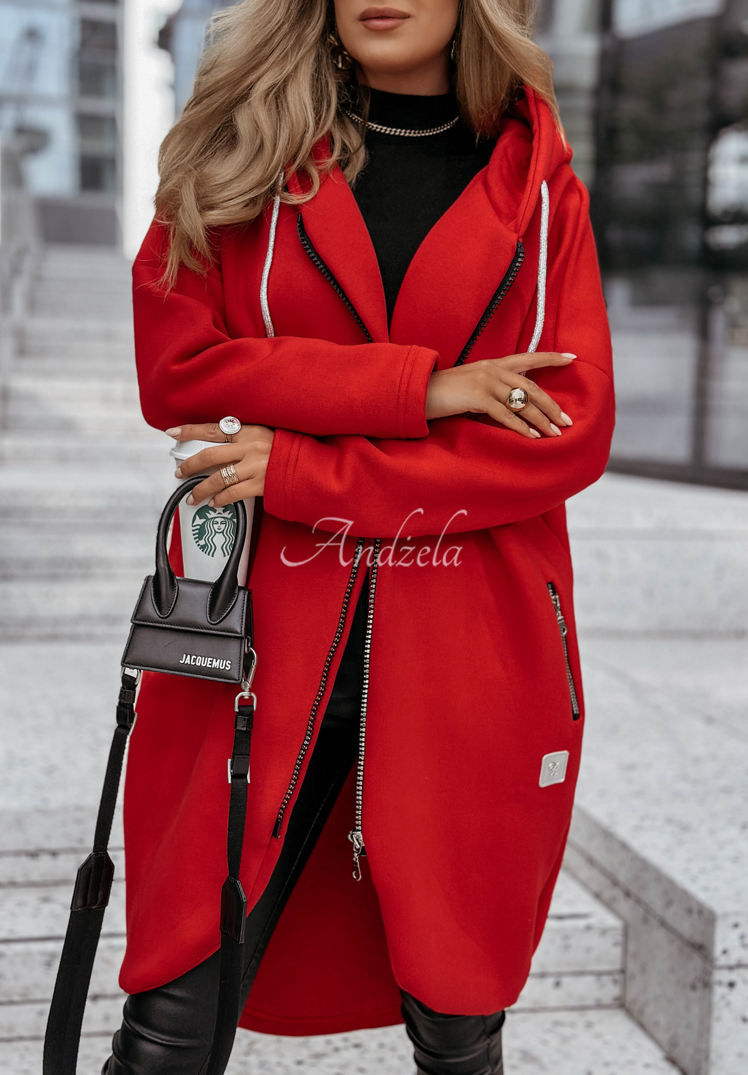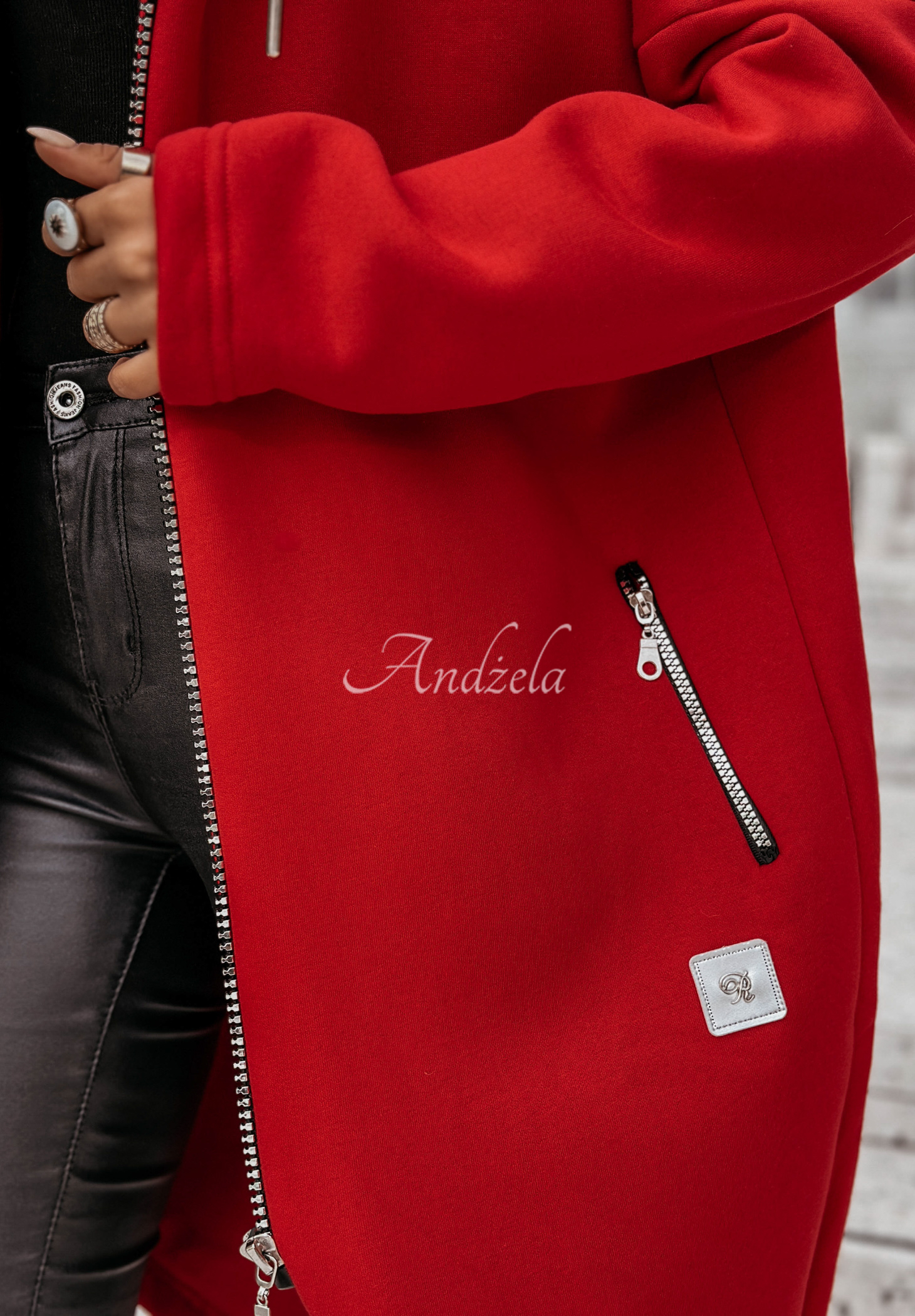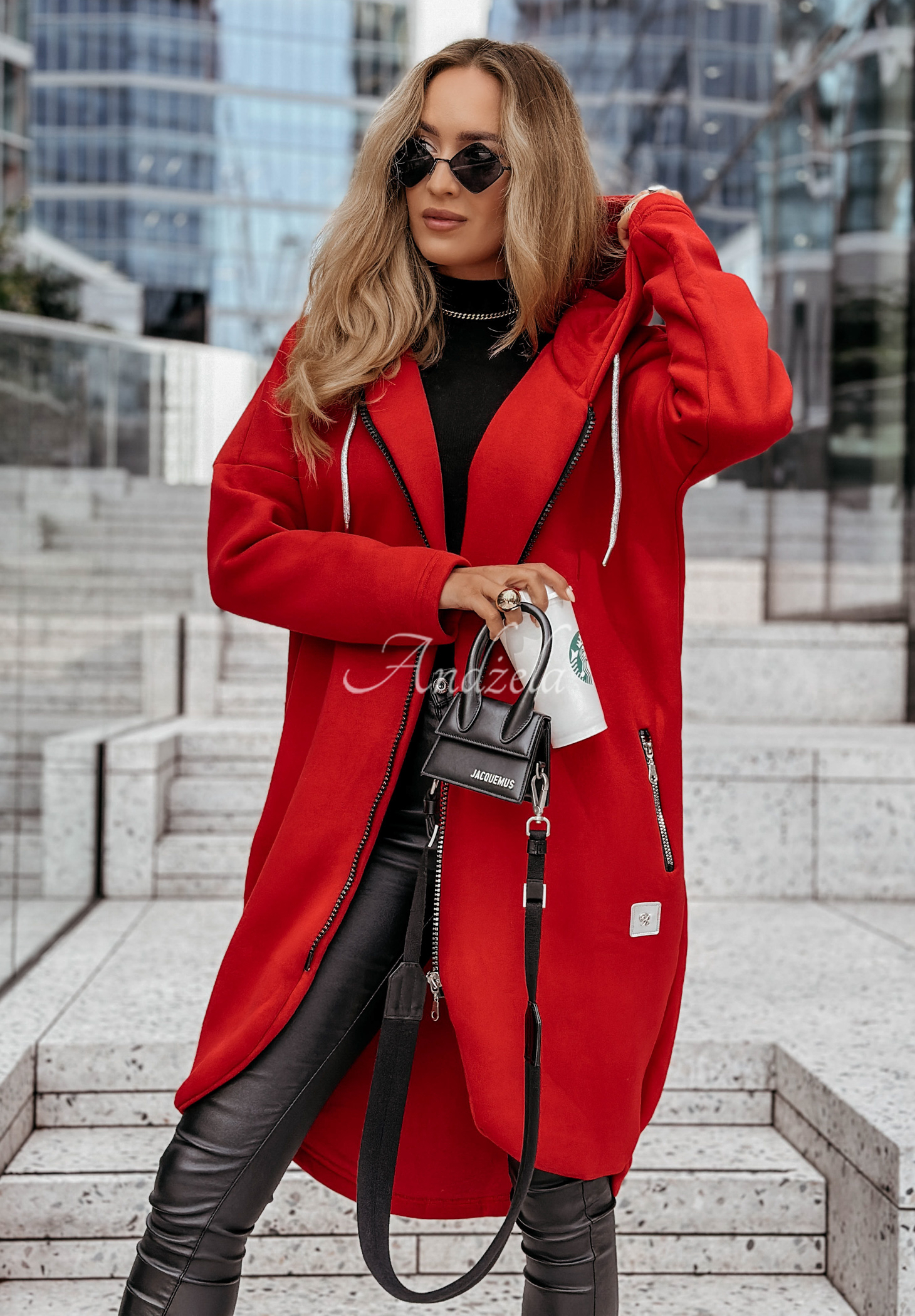 The long cotton sweatshirt is a great choice for comfortable styling. The whole piece is insulated, so it will be great for colder days. It is a slightly asymmetrical model with a hood, and it is fastened with a zipper. It has long sleeves, and there are functional zippered pockets on the front.