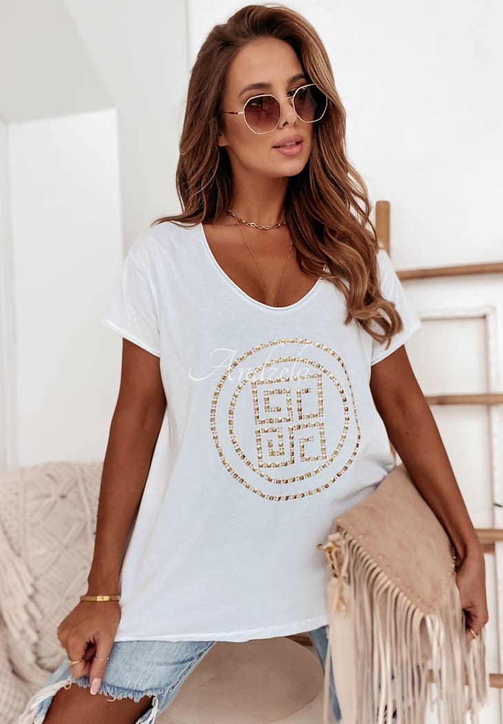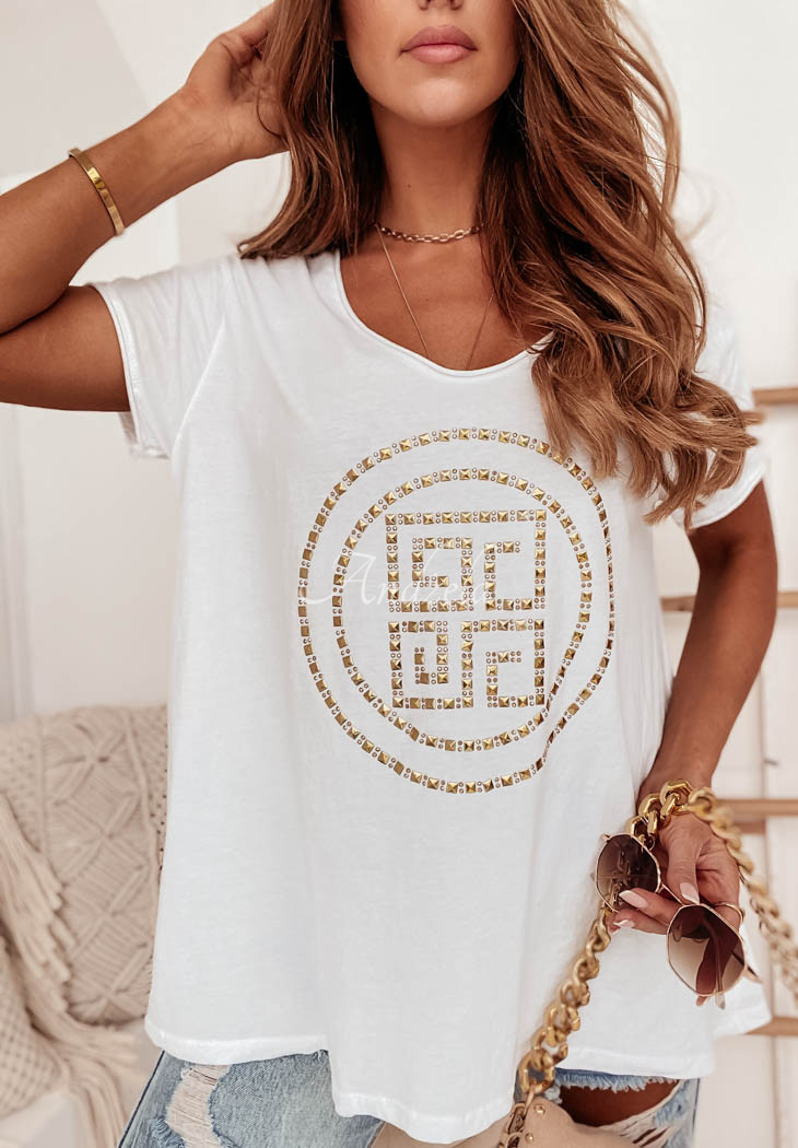 A classic oversized T-shirt made of high-quality material is the basis of any everyday styling. The model with a deep heart-shaped neckline is distinguished by an original applique on the front, which will give the whole thing a modern, as well as fashionable look. Compose it with shorts or a short skirt. Available in two color versions.