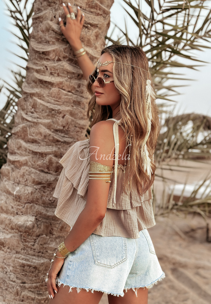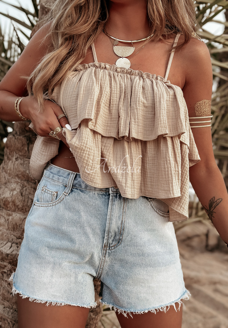 Cotton top made of high-quality muslin fabric is a perfect proposition for summer days! It is distinguished by light frills, giving the whole thing a girlish charm. It is a short cut model with an elastic band at the top. It has tied, adjustable straps, so you can perfectly adjust it to your figure. Design by ANDŻELA!