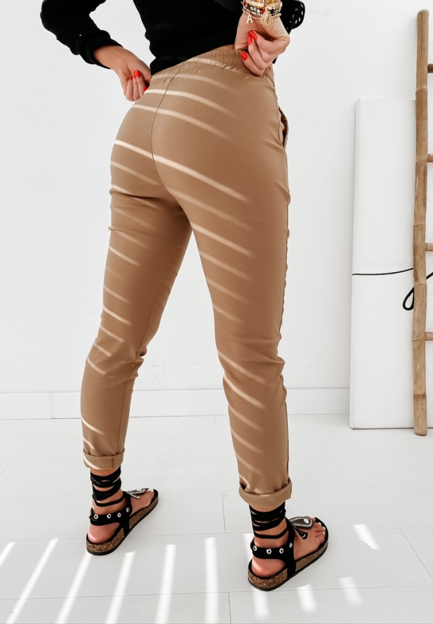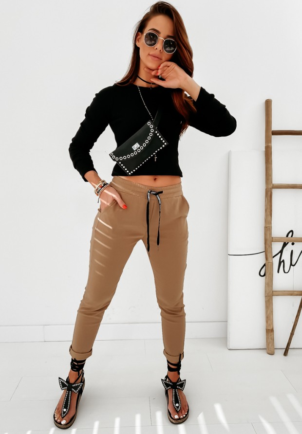 Material pants are a great base for everyday styling and more. Model with a drawstring and adjustable hem, will perfectly emphasize your figure. The cut has pockets on the front. They are available in many color versions.