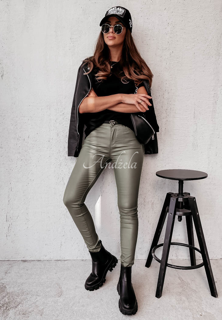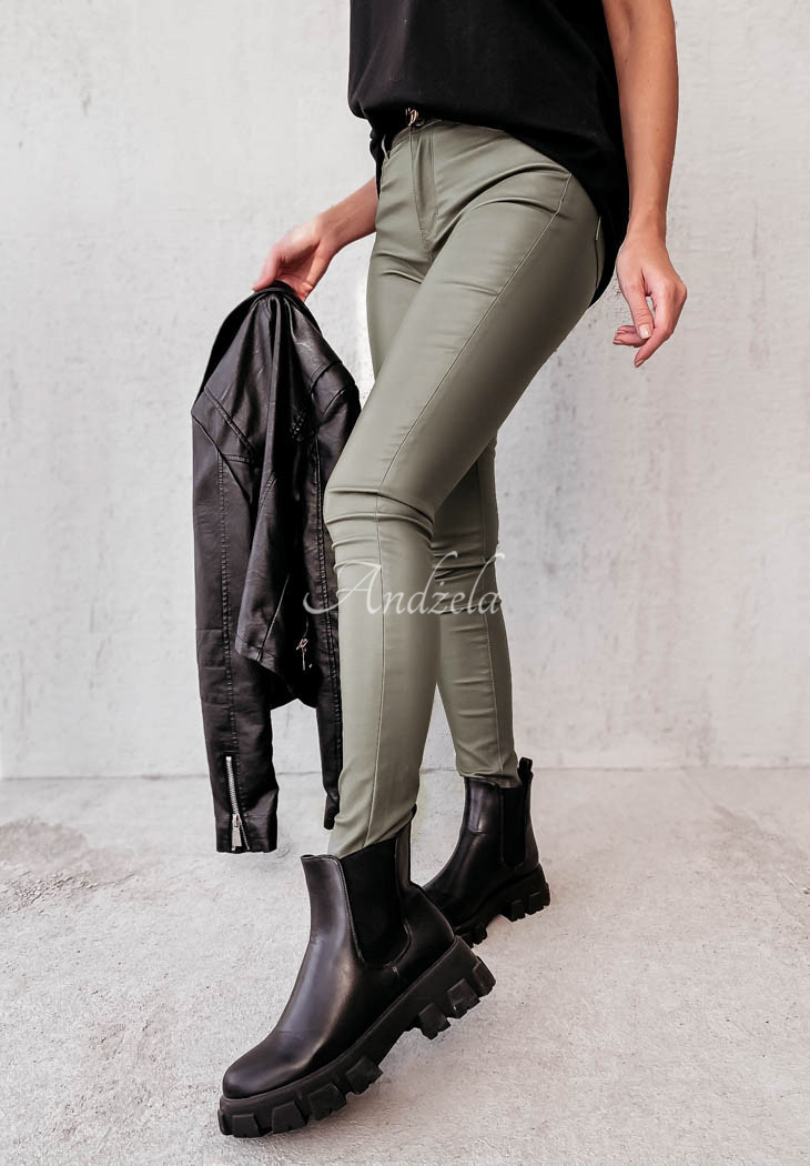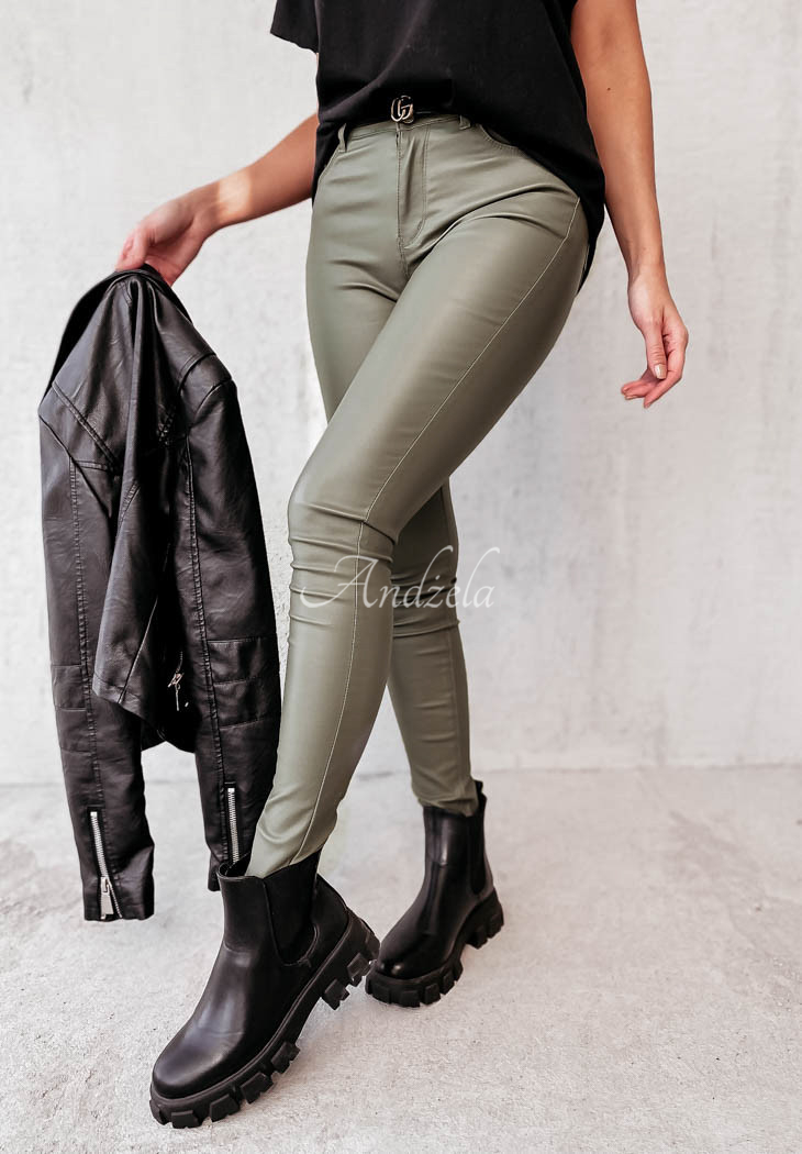 Fitted pants made of imitation leather material. The model is fastened with a zipper and a button, and has pockets on the back. It will add character to any of your styling, will undoubtedly present an original look and emphasize the silhouette. A very comfortable proposition, available in several color variants.