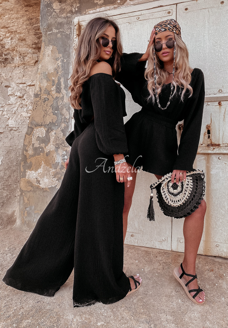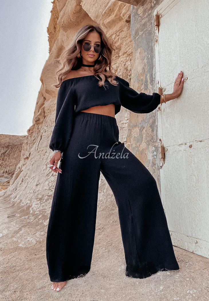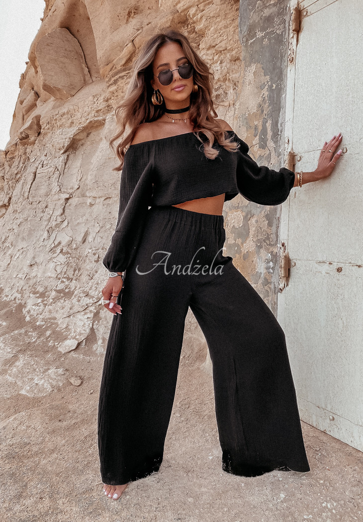 Delicate pants with wide legs and a high waist, made of high-quality muslin fabric. The model has an elastic waistband for a perfect fit. T is an ideal choice for many summer outfits, compose them with a blouse or top from the same collection and ensure a perfect vacation look! High quality product, available in several color variants. Design by ANDŻELA!