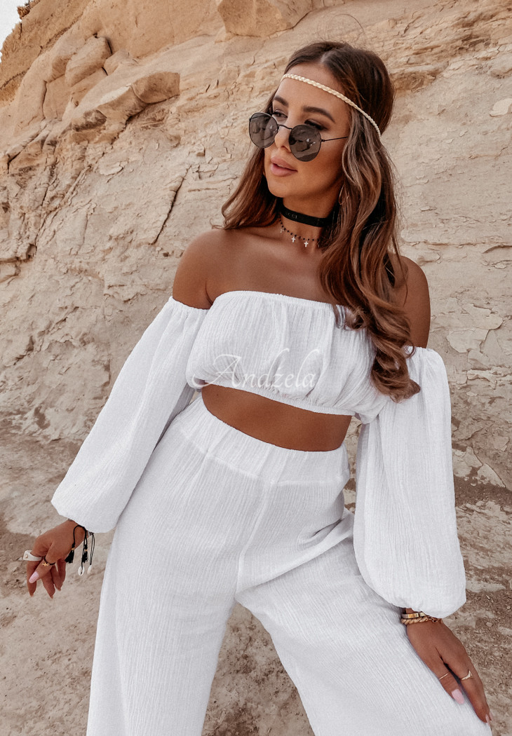 Delicate pants with wide legs and a high waist, made of high-quality muslin fabric. The model has an elastic waistband for a perfect fit. T is an ideal choice for many summer outfits, compose them with a blouse or top from the same collection and ensure a perfect vacation look! High quality product, available in several color variants. Design by ANDŻELA!
