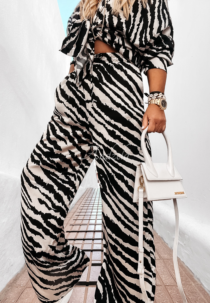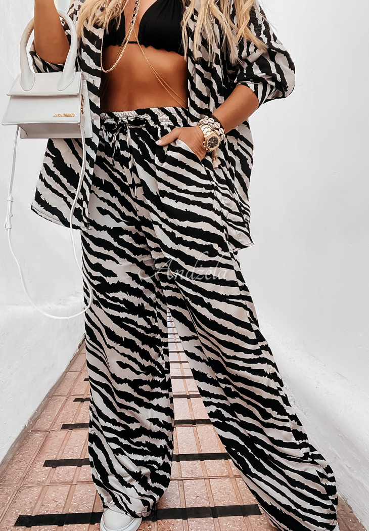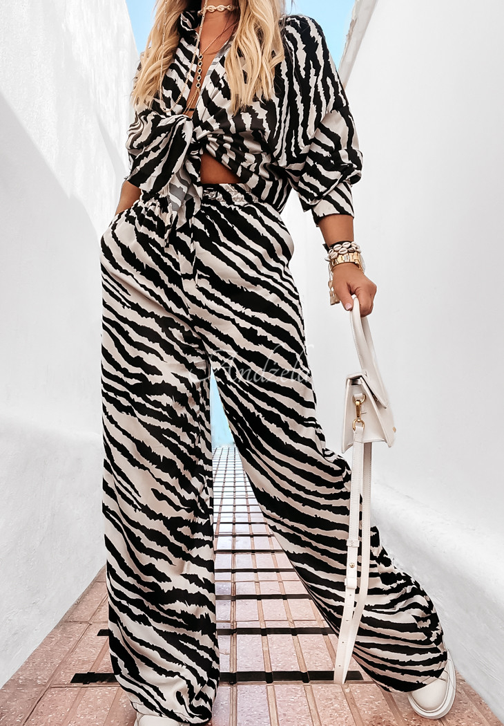 Satin pants with wide leg type. The high-waisted model has pockets on the front and a drawstring elastic waistband. Compose them with a shirt from the same collection and create a set.