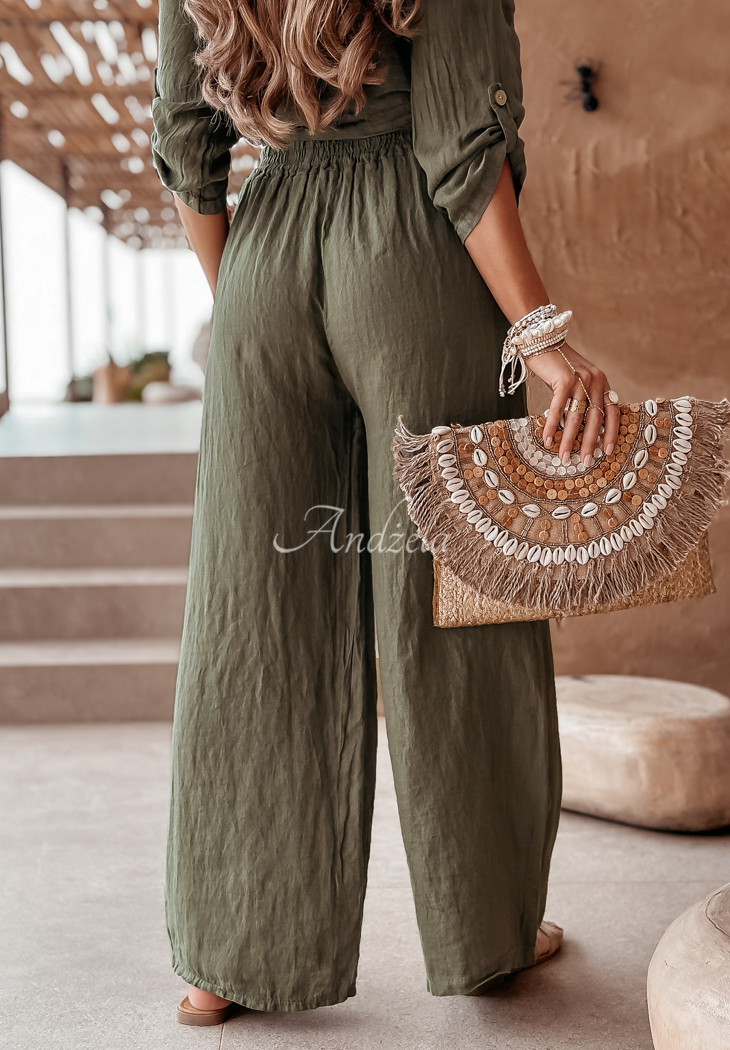 Pants with wide legs made of extremely lightweight linen fabric, perfect for summer. The model with pockets on the front has an elastic waistband with a drawstring, thanks to which they fit perfectly to the figure.