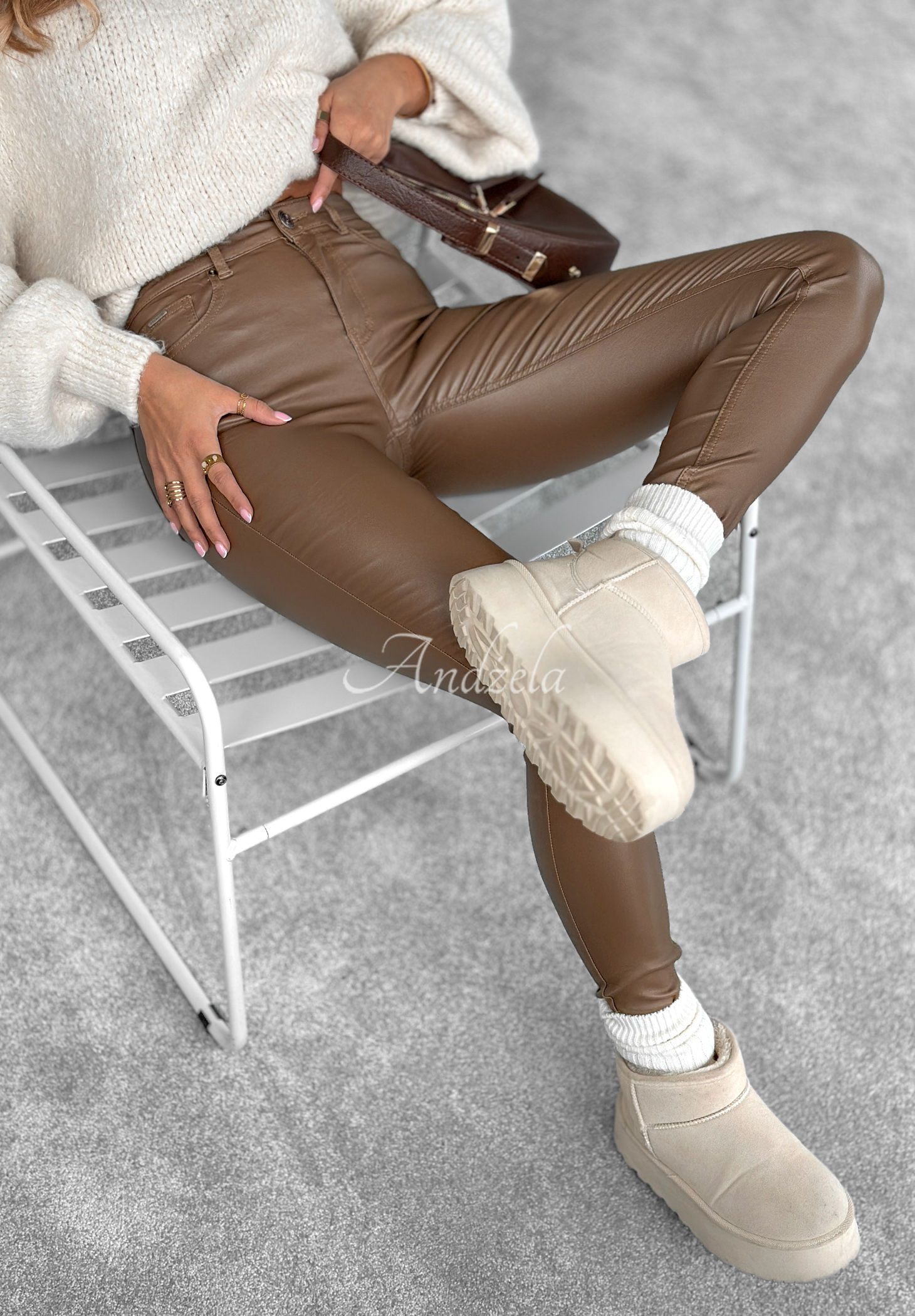 Fitted, waxed pants will become a perfect base for many everyday looks and more. Zippered and buttoned, they feature front and back pockets. Push up pants, will highlight your figure. Compose them with an oversized T-shirt, boots and a Ramones and your styling will delight not only you.