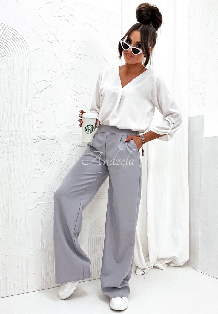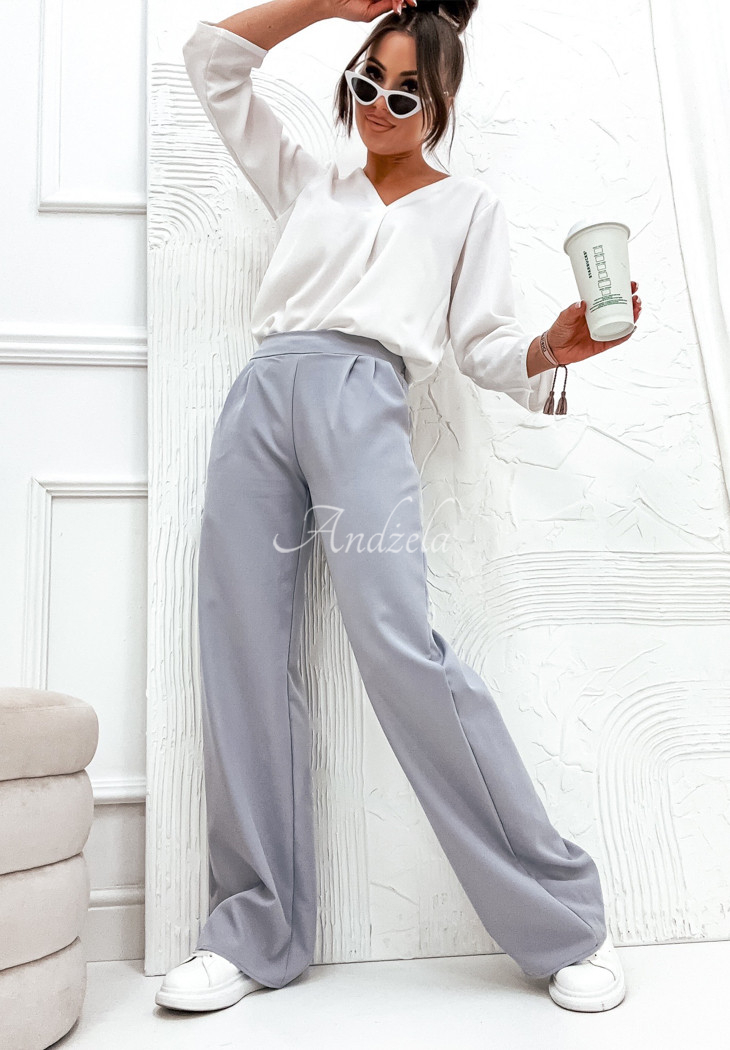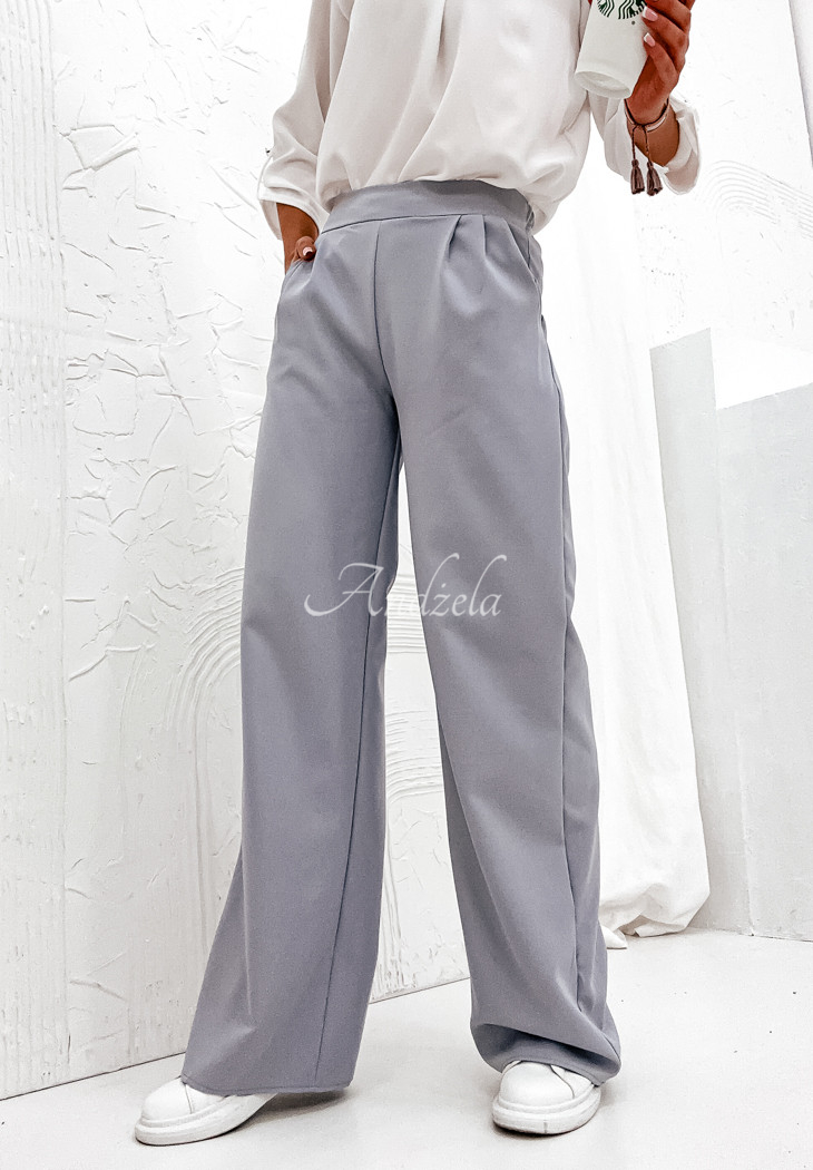 Material, lightweight pants are an excellent base for both casual and elegant looks. They are distinguished by fashionable, wide legs, which will look great on different body types. This is an unbuttoned model with front pockets and an elastic waistband, thanks to which it fits perfectly to the figure.