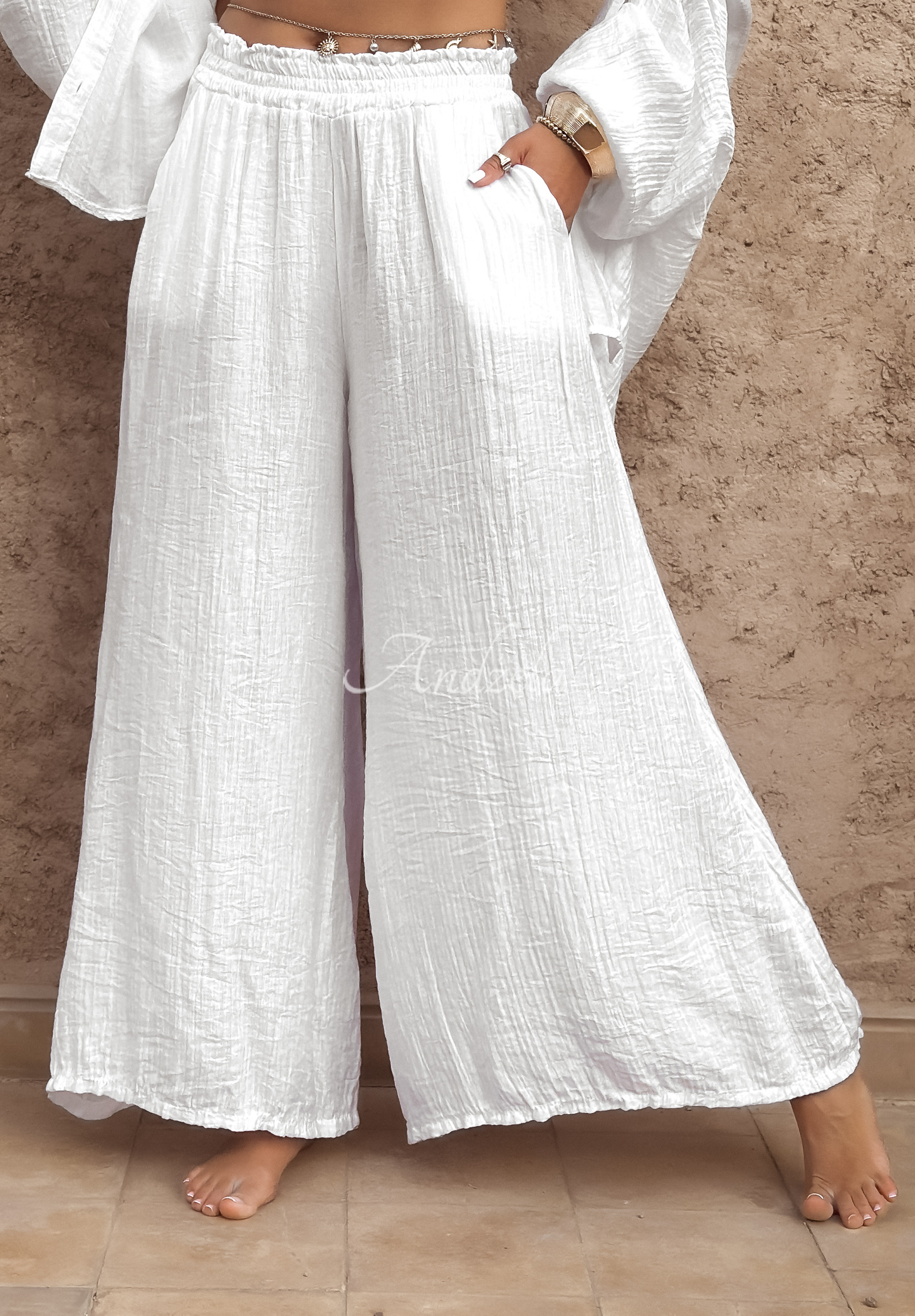 Material pants made of lightweight, pleasant to the touch fabric. This is a wide leg cut model with a straight, wide leg and high rise. There is an elastic waistband and functional pockets on the front. The whole piece will look great paired with a shirt from the Forever Holidays line.