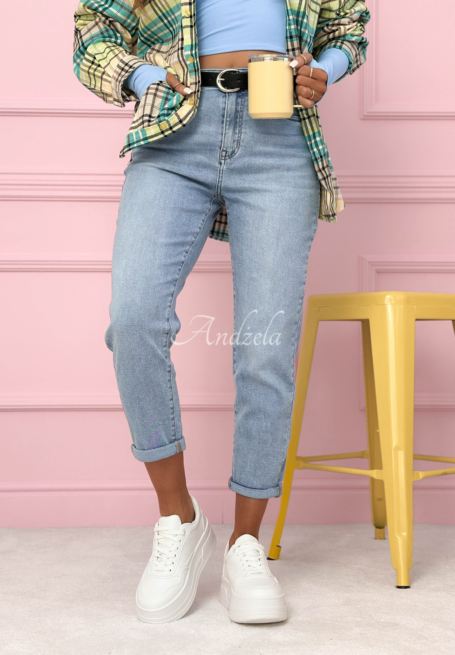 Mom fit jeans made of elastic fabric. This model has a high waist and fastens with a zipper and button. There are functional pockets on both the front and back. The set includes a belt with a tag.