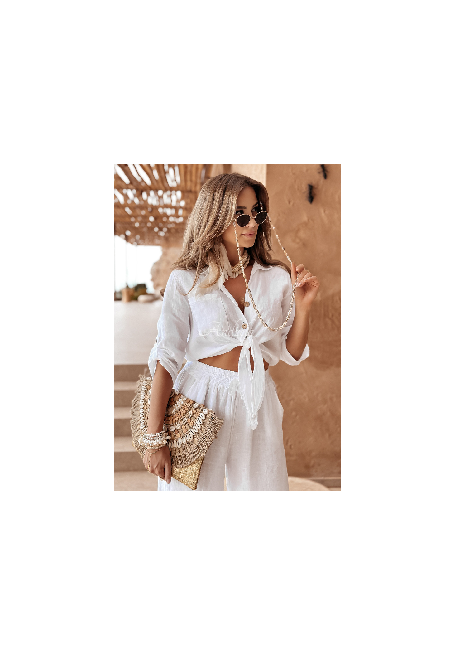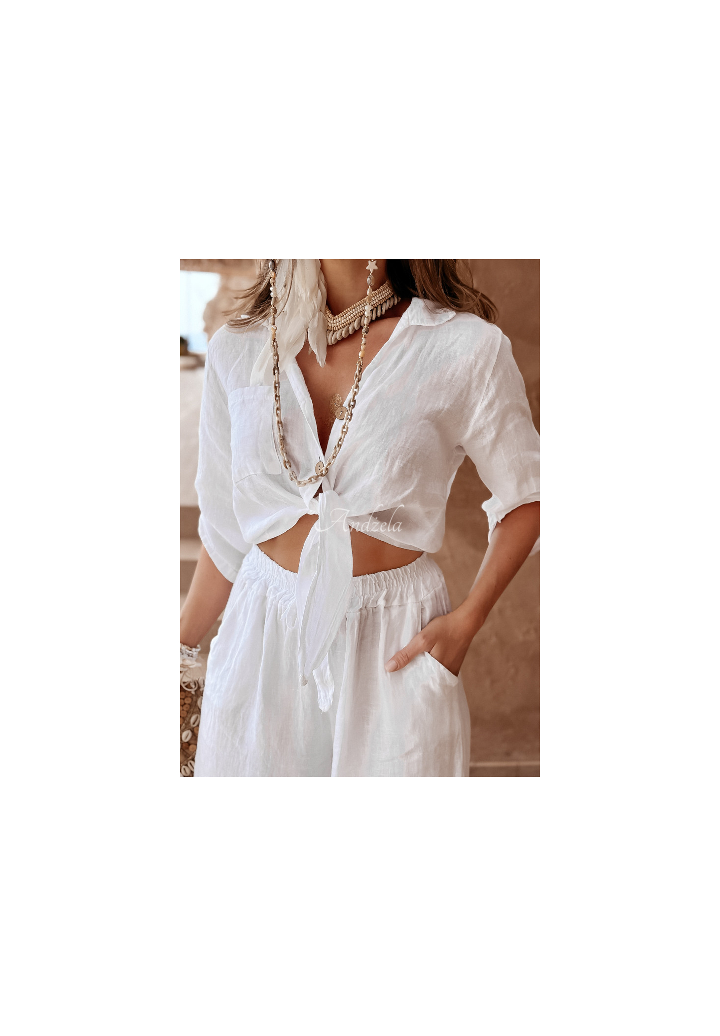 Kurzes Hemd aus hochwertigem Leinenmaterial. Mit Knopfverschluss, hat Ärmel mit der Möglichkeit der Feinregulierung ihrer Länge und Bindung an der Vorderseite. Auf der Höhe der Brust befindet sich eine Tasche. Dieser Vorschlag ist für jeden perfekt Sommergarderobe und passt perfekt zu Alltagslooks.