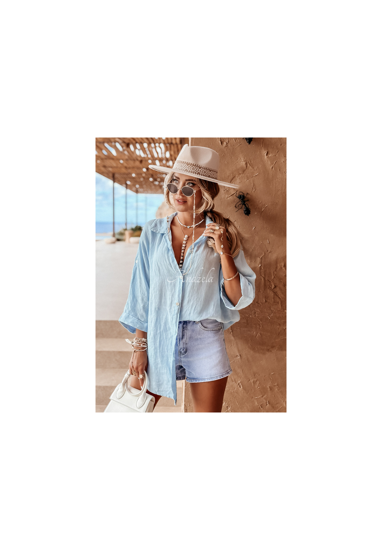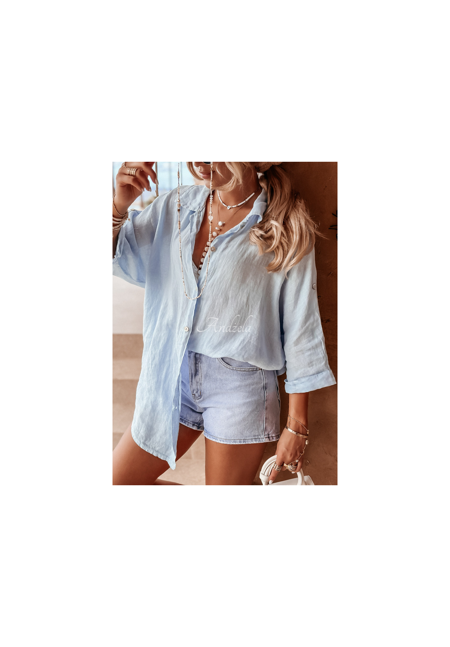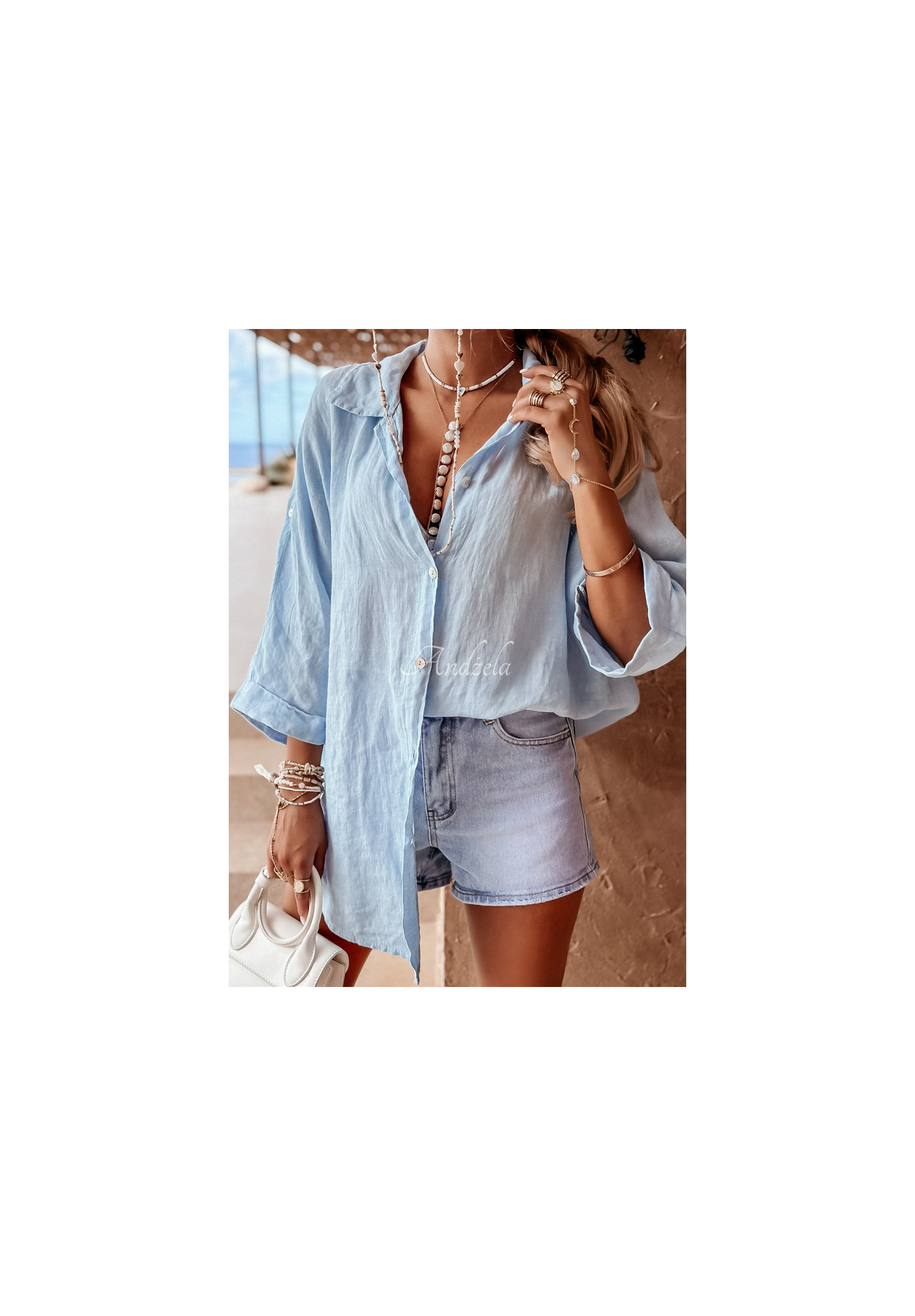 Leichtes Hemd aus hochwertigem Leinen. Es hat einen Knopfverschluss, einen Kragen und verstellbare Ärmel. Der Oversize-Schnitt passt perfekt zu lockeren Outfits.