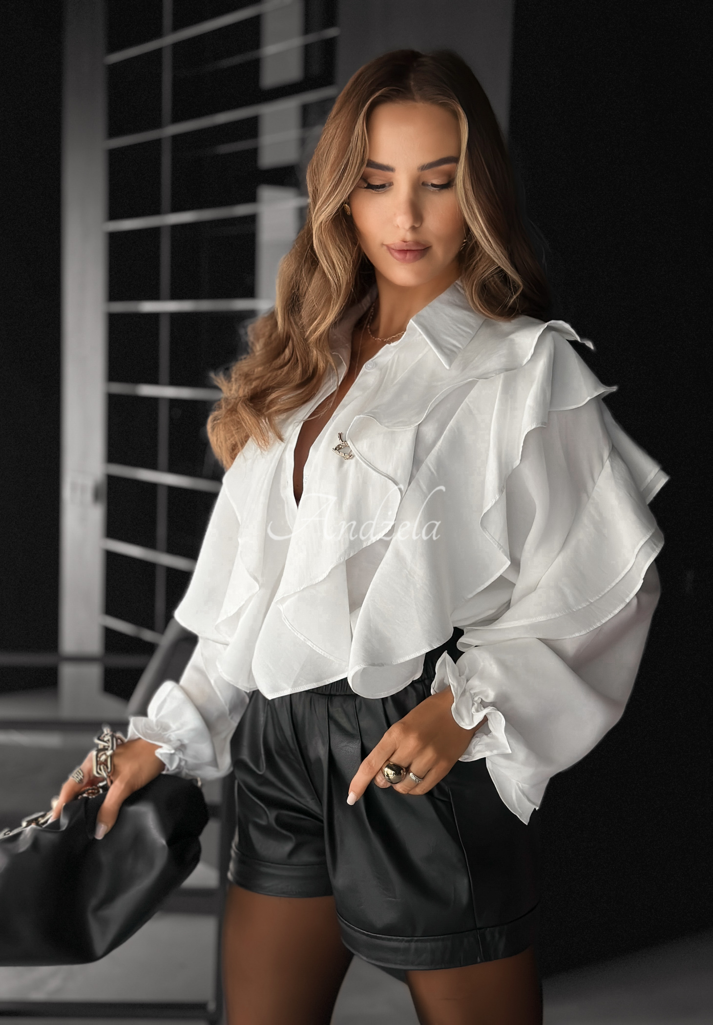 Ein fließendes Hemd aus Viskose mit einem Hauch von Baumwolle. Es besticht durch zahlreiche Rüschen und weite Ärmel mit gerippten Bündchen. Das klassische Design mit Kragen und Knopfverschluss ist ein echter Hingucker.