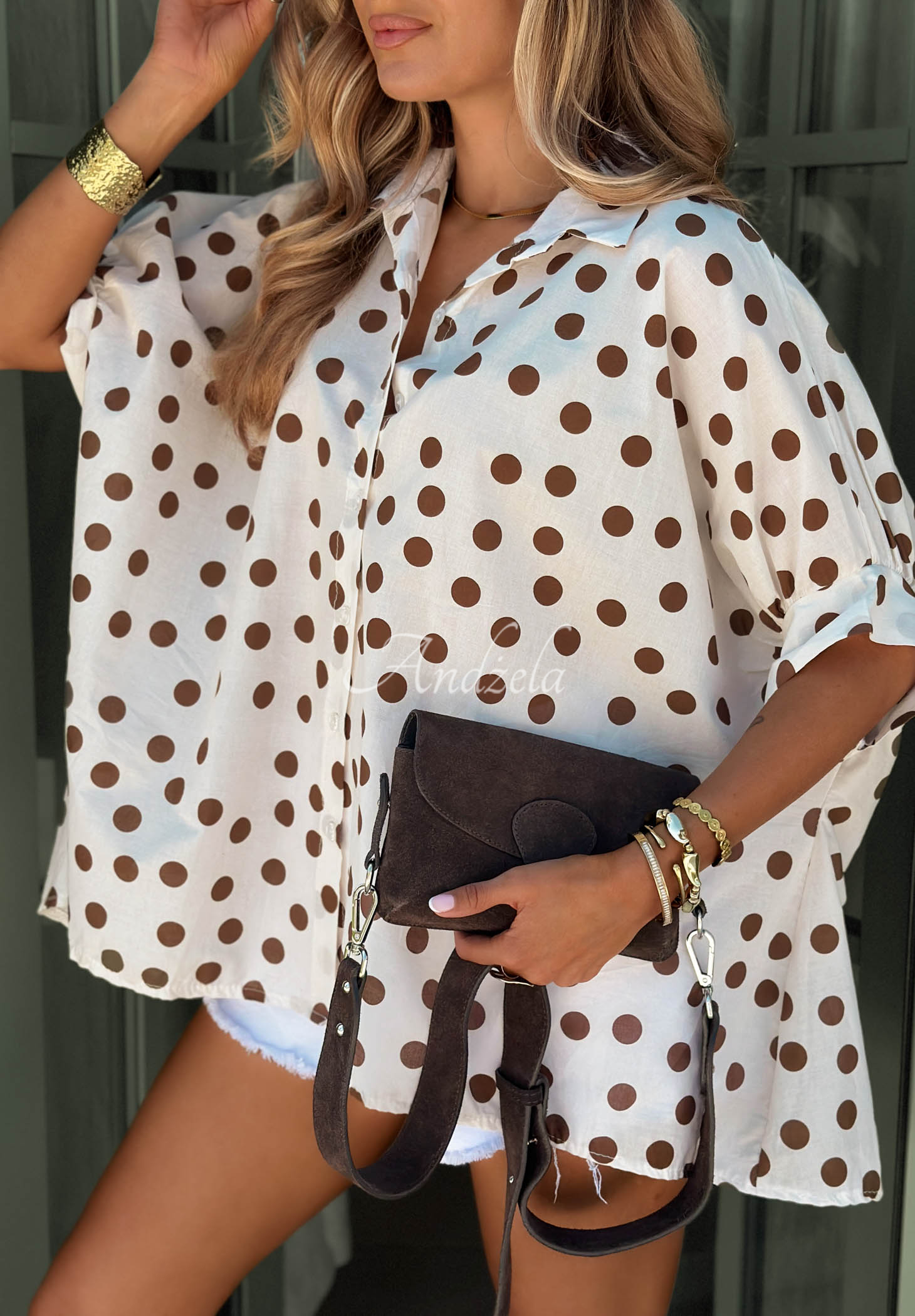 Ein leichtes, gepunktetes Hemd aus Baumwolle. Es hat eine Oversize-Passform mit verlängertem Rückenteil. Es wird mit Knöpfen geschlossen, hat kurze Ärmel mit breiten Manschetten und einen Kragen.