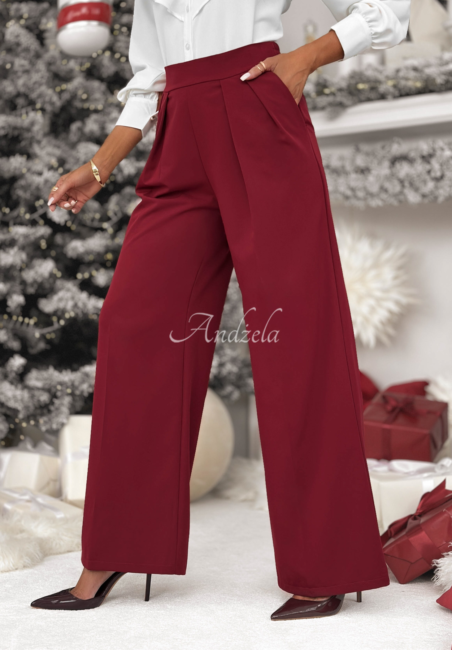 Elegante Hose aus einem nicht dehnbaren Viskose-Mix. Diese Hose mit weitem Bein hat Bundfalten und einen elastischen Bund hinten. Sie ist hoch geschnitten und verfügt über praktische Vordertaschen.