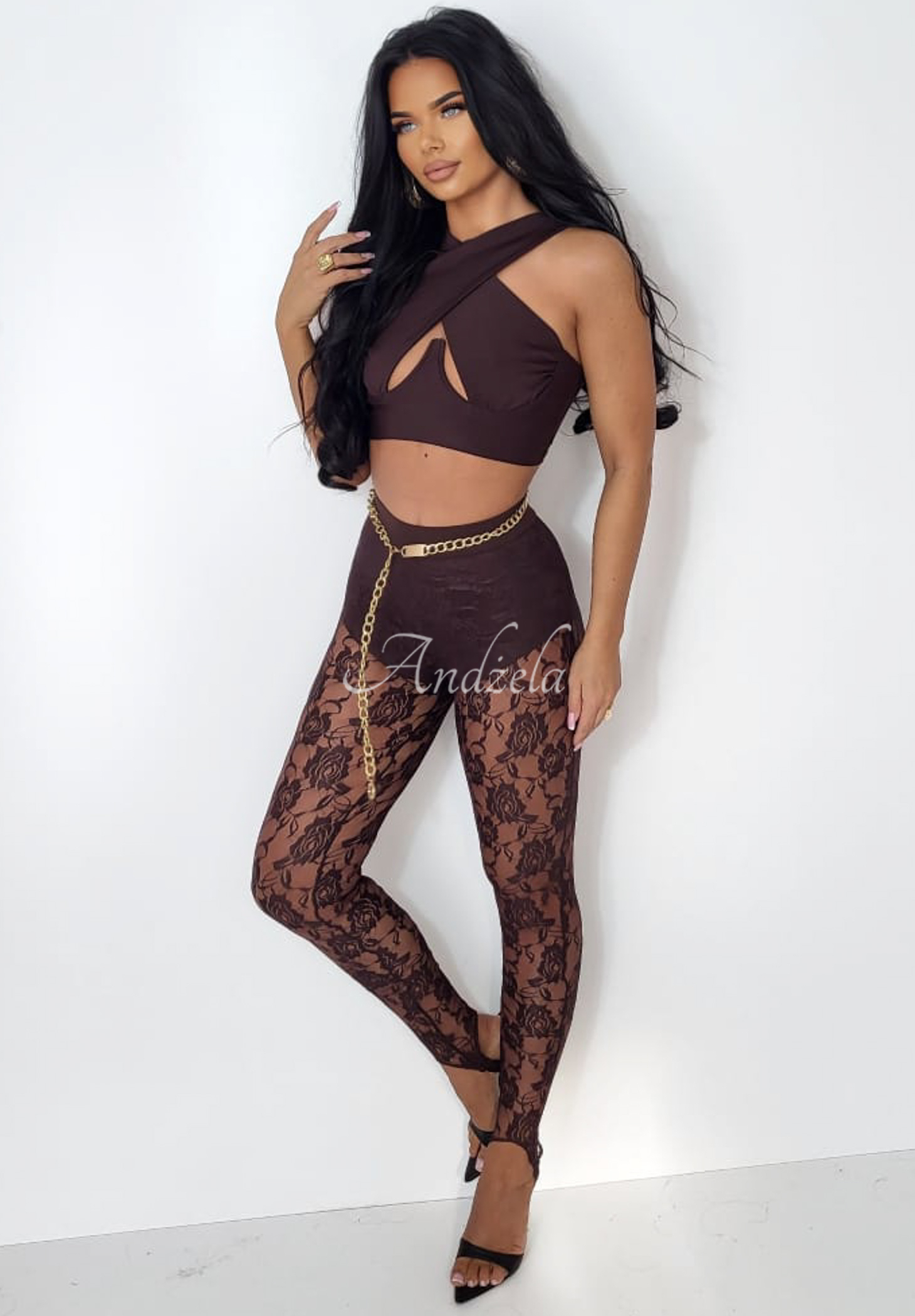 Viskose-Leggings mit Spitze und Fersenkappen Dreaming Of Lace Schokoladenbraun