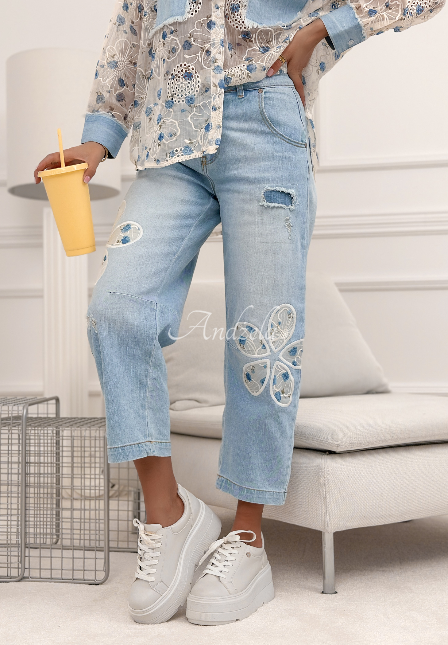 Jeans im Mom-Fit-Schnitt, die sich durch dekorative, gestickte Blumen auszeichnen. Dieses Modell hat einen höheren Bund und nach unten hin schmal zulaufende Hosenbeine und wird mit einem Reißverschluss und einem Knopf geschlossen. Es verfügt über praktische Taschen vorne und hinten sowie dezenten Used-Look.