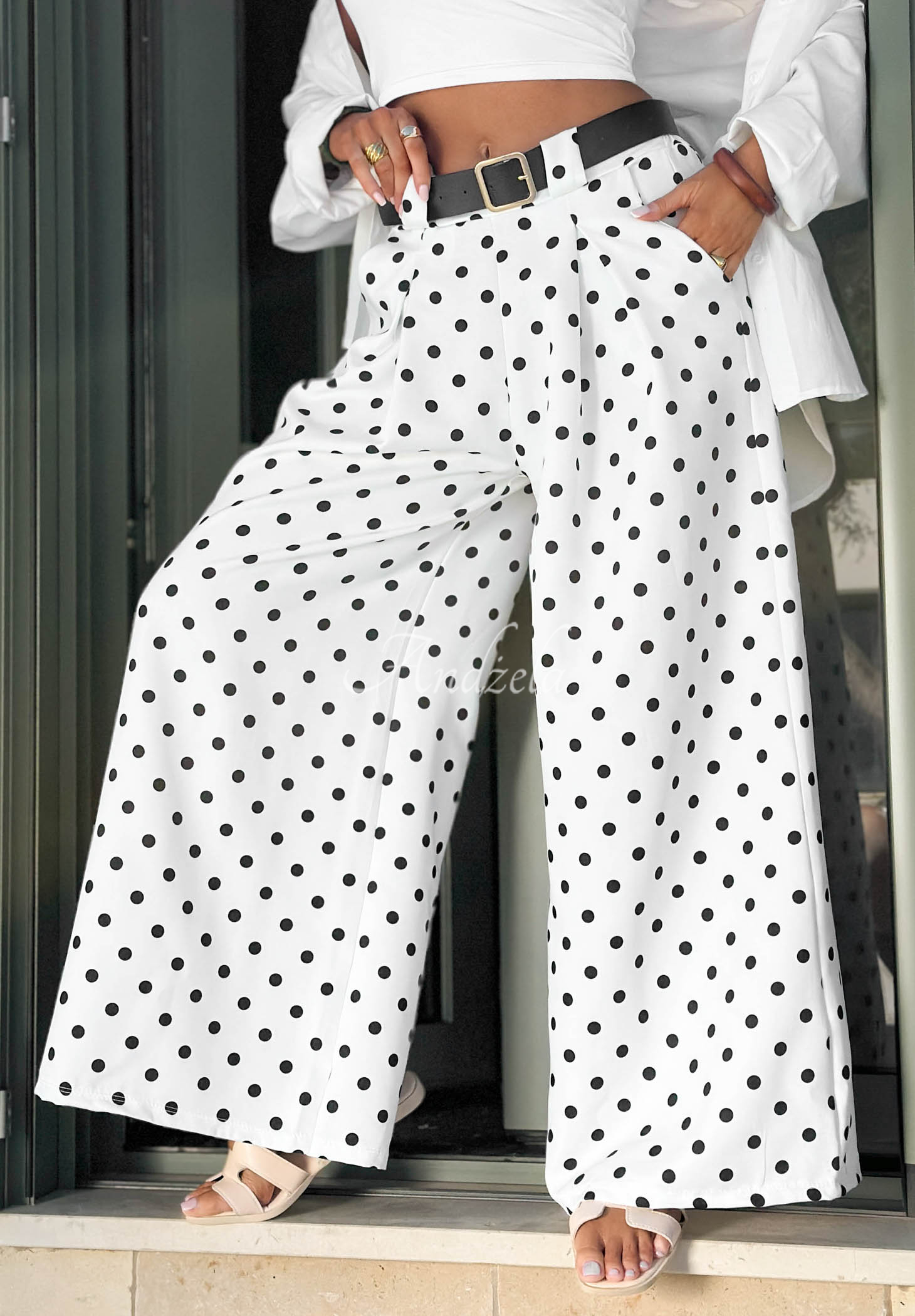 Weit geschnittene Hose mit Pünktchenmuster. Dieses hochgeschnittene Modell hat einen elastischen Bund hinten und praktische Taschen. Ein Gürtel mit goldener Schnalle ist inklusive.
