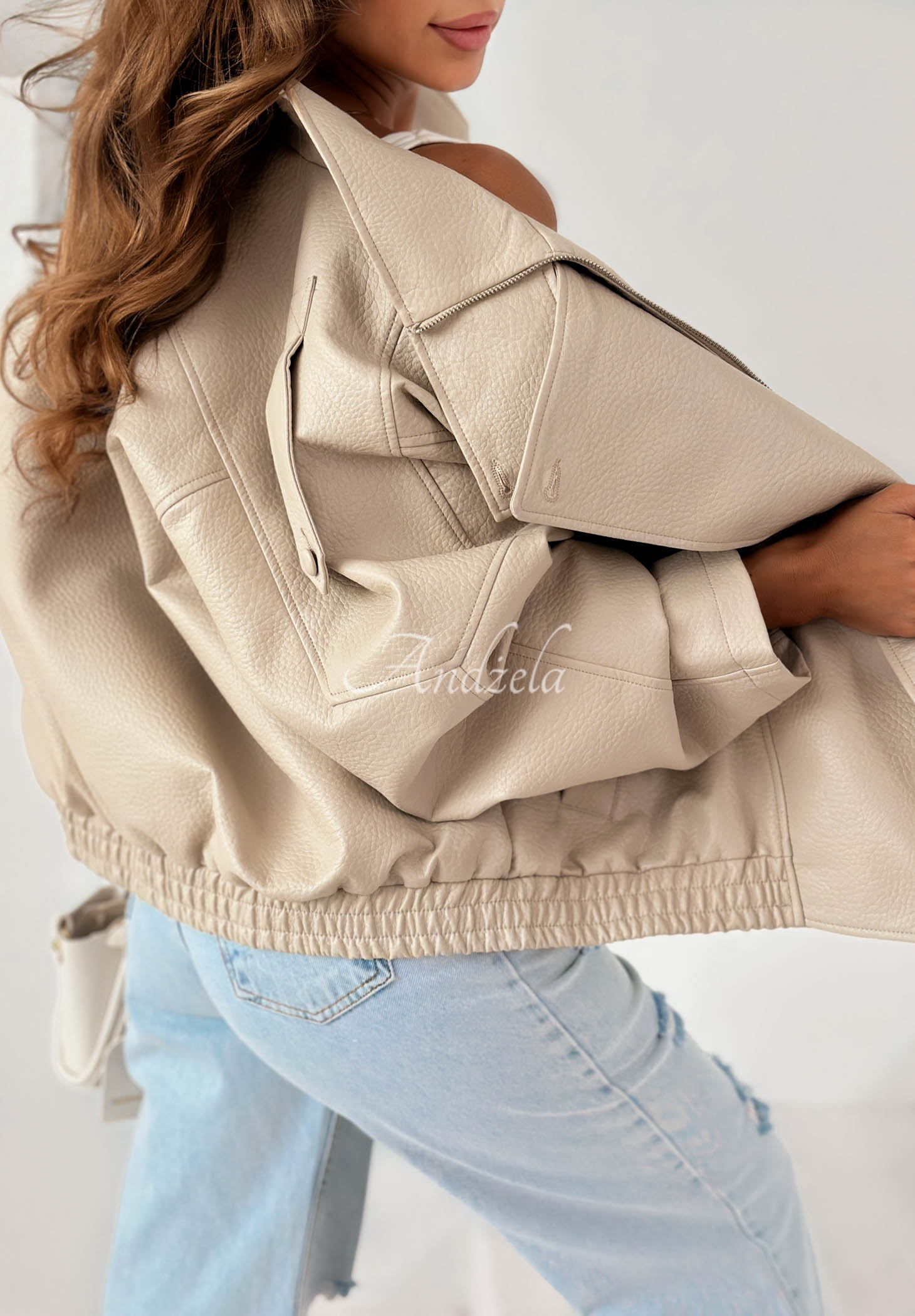 Lederjacke mit Kragen und leicht oversize-Schnitt. Dieses Modell verfügt über praktische Taschen und einen elastischen Bund am Saum. Es hat Knöpfe und einen Reißverschluss und ist gefüttert.
