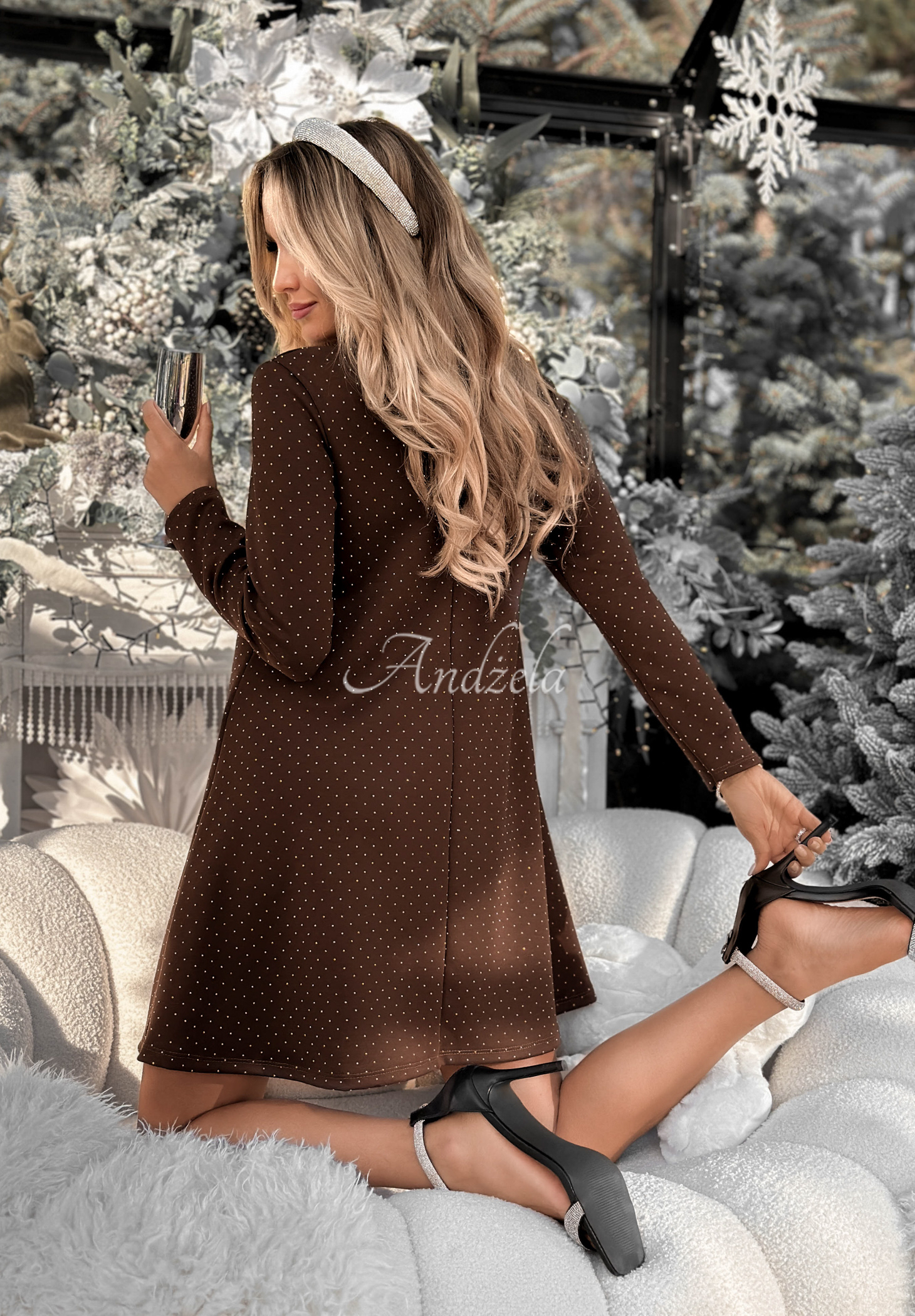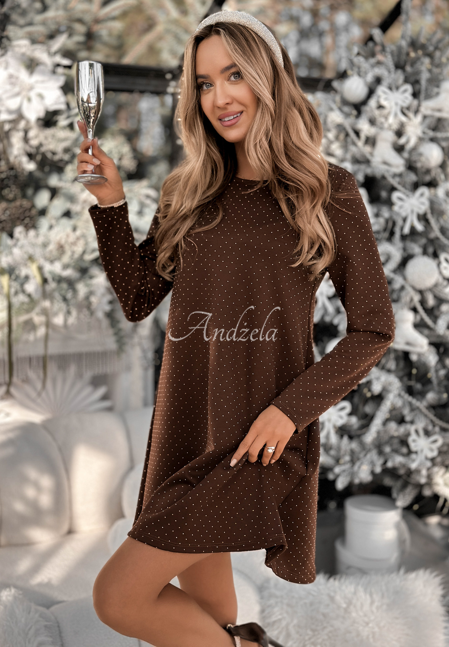 Ein einzigartiges Kleid mit schimmernden Kristallen aus elastischem Stoff mit einem Hauch Viskose. Das ausgestellte Kleid hat einen Rundhalsausschnitt.* Elastisches Material* Kristalle überall* Rundhalsausschnitt* Minilänge* Ausgestellt