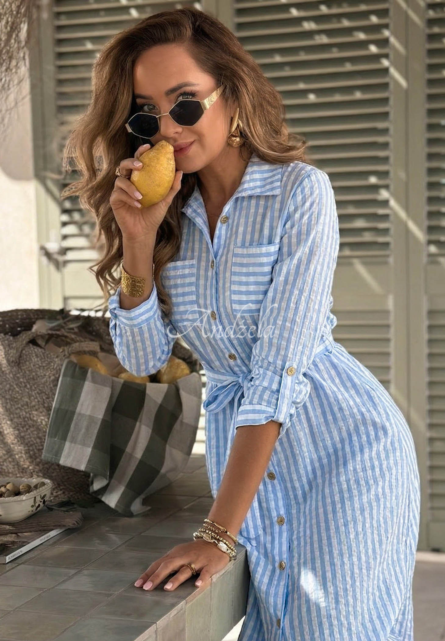 Ein luftiges Maxikleid mit einem modischen, karierten Muster. Das Modell hat einen Hemd-Schnitt mit ausgestelltem Saum und goldenen Knöpfen. Es verfügt über einen Kragen und Taschen auf Brusthöhe. Die langen Ärmel lassen sich hochkrempeln und anpassen; im Set ist auch ein Stoffgürtel enthalten.