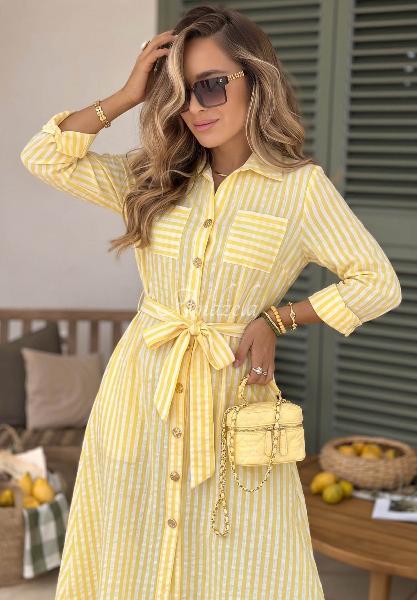 Ein luftiges Maxikleid mit einem modischen, karierten Muster. Das Modell hat einen Hemd-Schnitt mit ausgestelltem Saum und goldenen Knöpfen. Es verfügt über einen Kragen und Taschen auf Brusthöhe. Die langen Ärmel lassen sich hochkrempeln und anpassen; im Set ist auch ein Stoffgürtel enthalten.