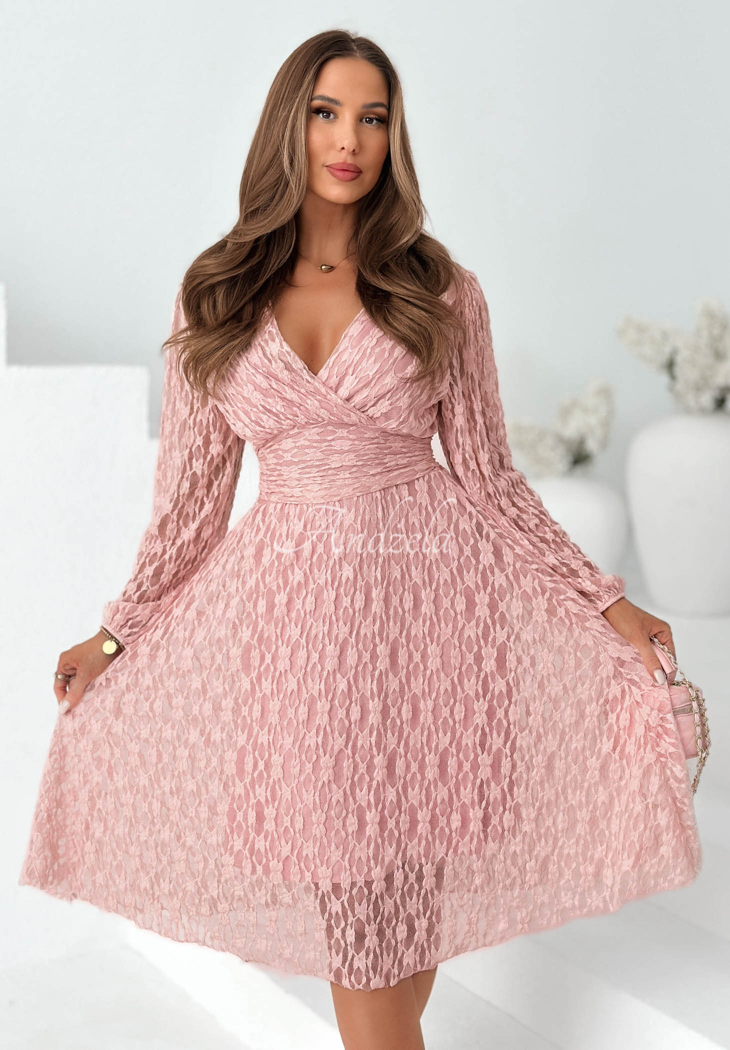 Ein Spitzenkleid mit Wickelausschnitt. Dieses Modell besticht durch einen dekorativen Gürtel in der Taille und ein Bindeband auf der Rückseite. Es verfügt über einen Gummizug an den Ärmelenden.
