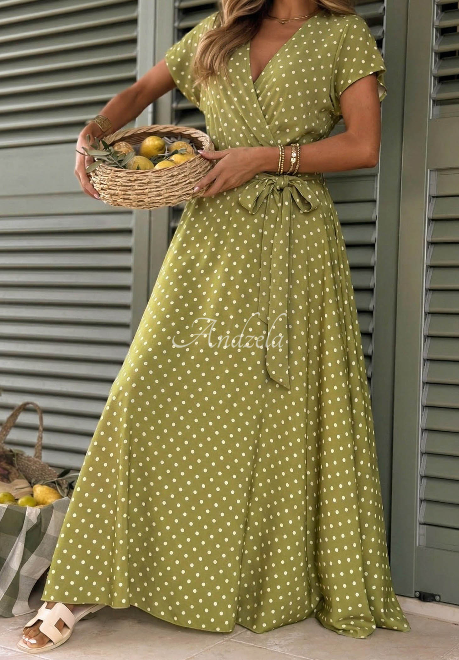 Kleid mit modischem Print, hergestellt aus einem leichten und angenehmen Stoff. Umschlag am Ausschnitt und Beinschlitz. Es hat einen elastischen Bund. Es ist ebenfalls ein Stoffgürtel enthalten.