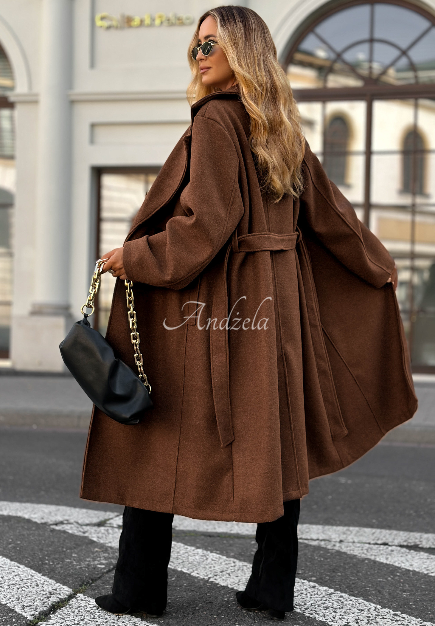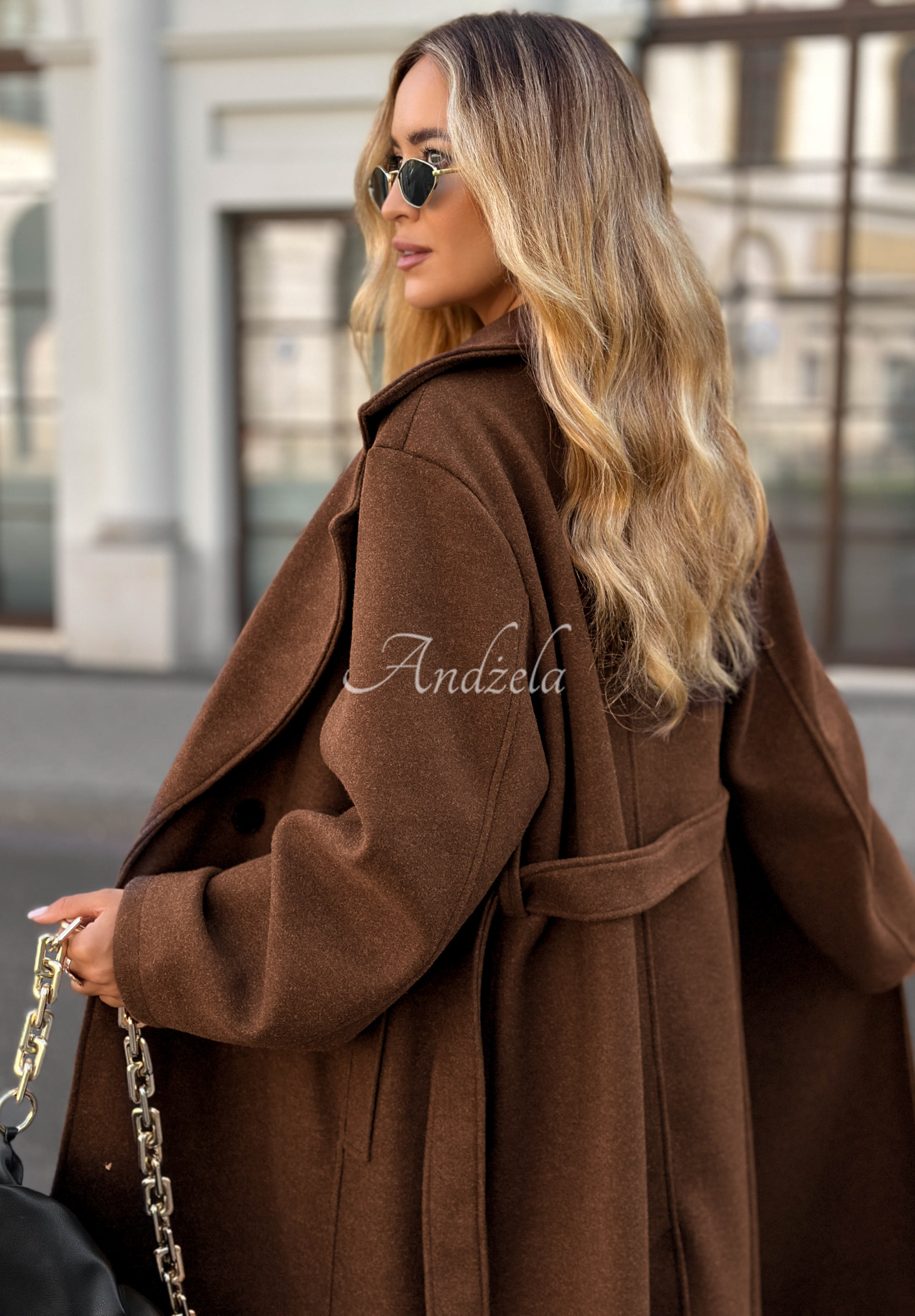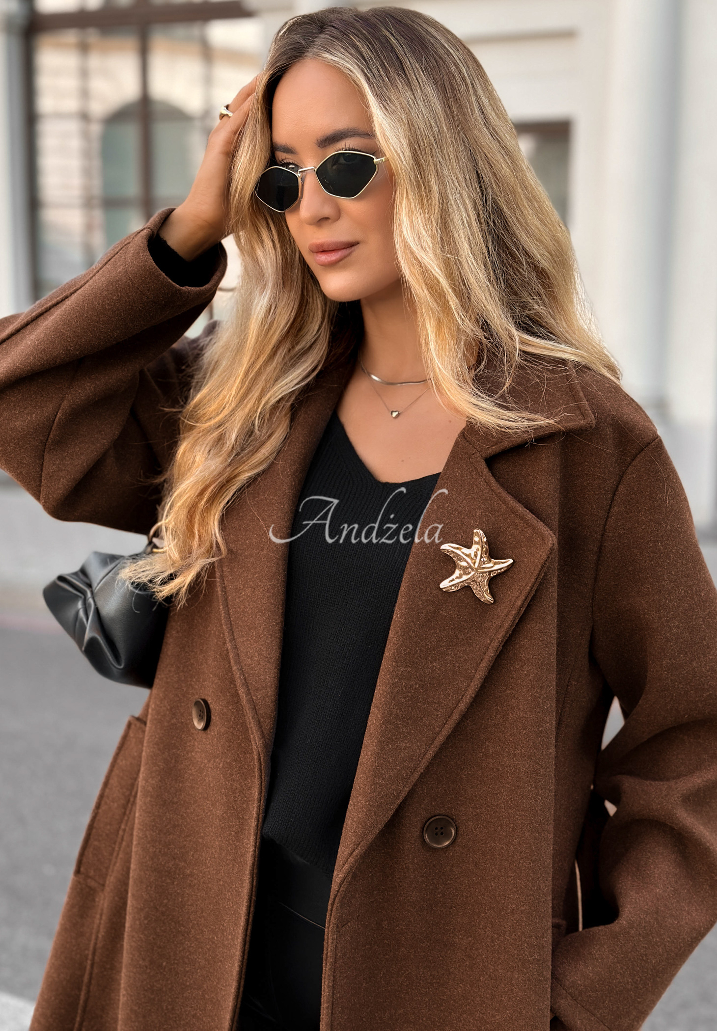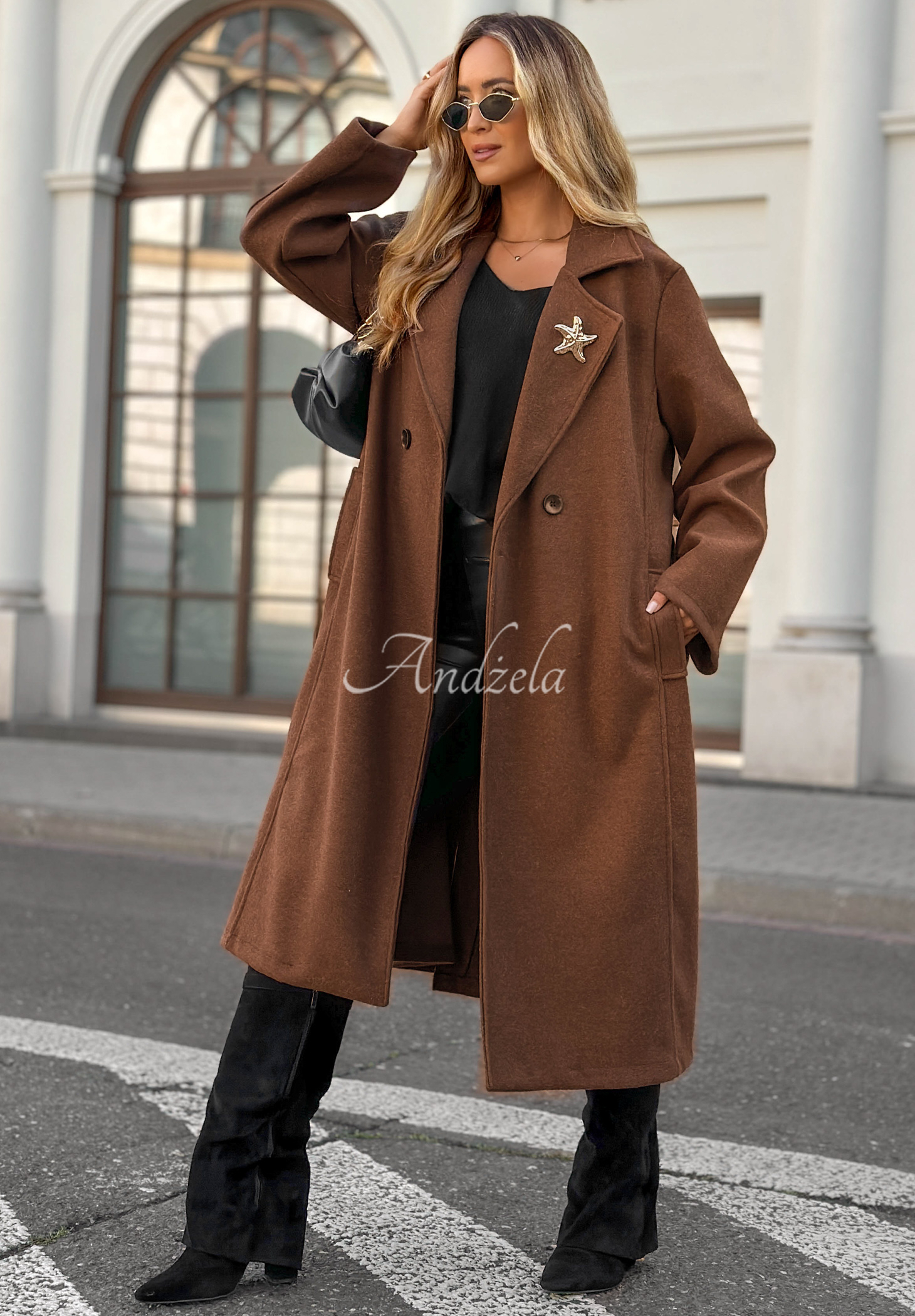 Dieser Mantel besteht aus einem weichen, bequemen Stoff mit einem Hauch Viskose. Er ist länger geschnitten und verfügt über einen Kragen. Er hat praktische Taschen und einen Knopfverschluss vorne. Ein Stoffgürtel und eine Brosche runden den Look ab.