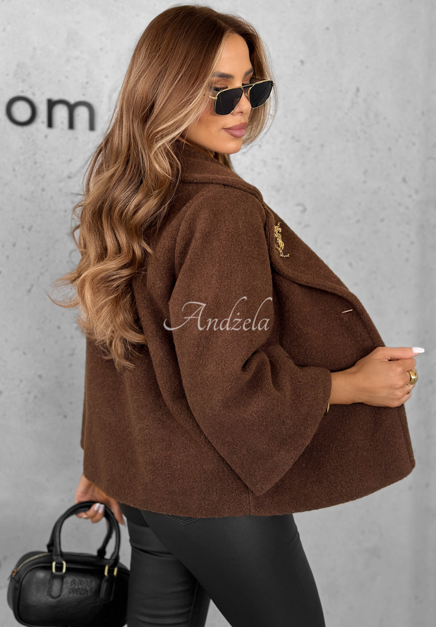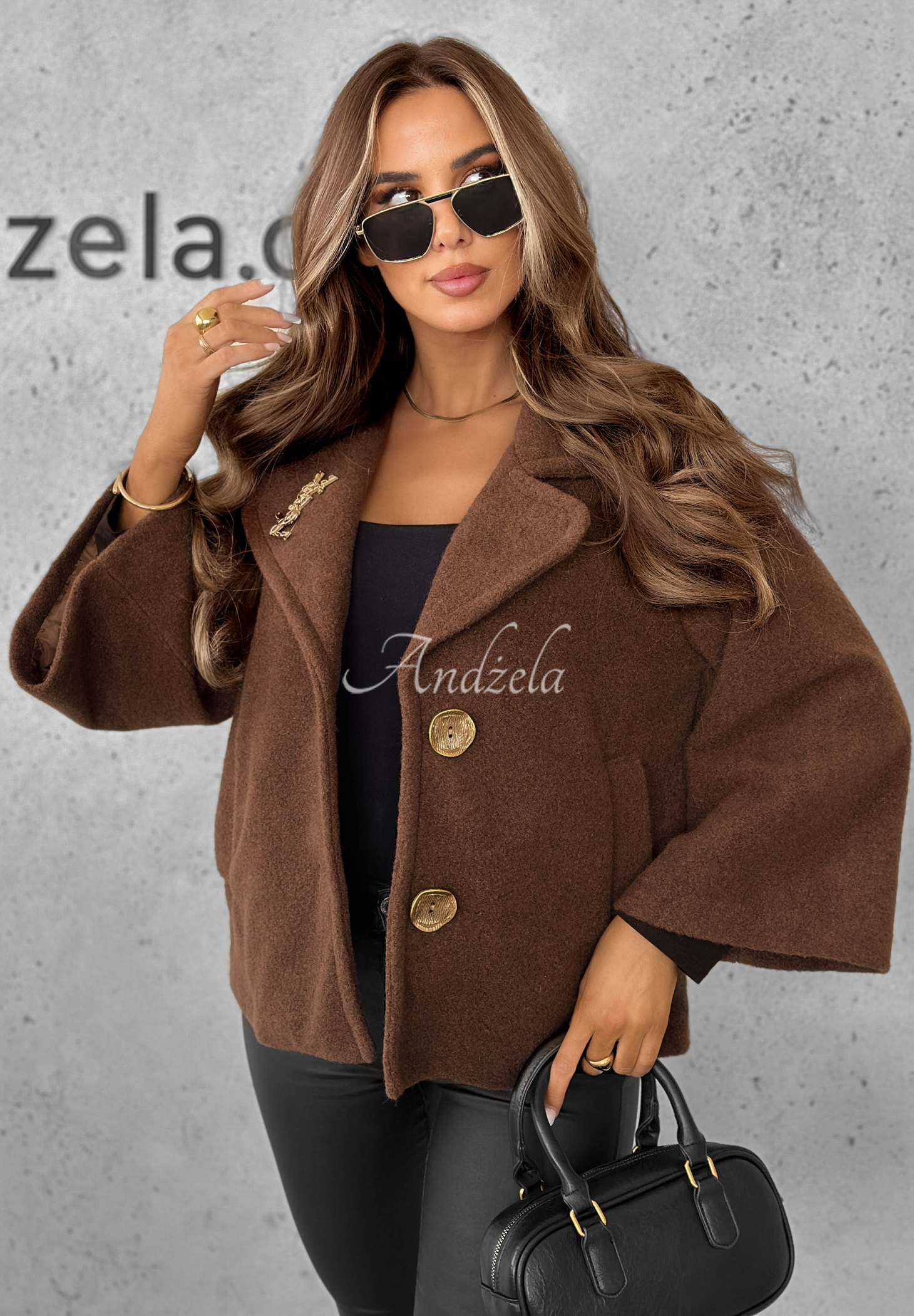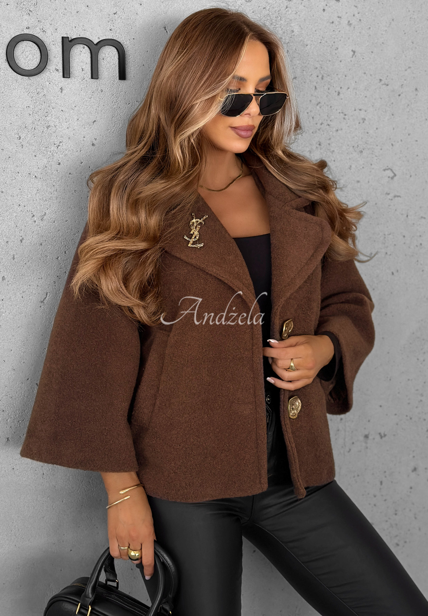 Ein kürzerer Mantel aus weichem Stoff. Er hat einen Oversize-Schnitt und weite Ärmel. Er verfügt über einen Kragen und goldene Knöpfe.