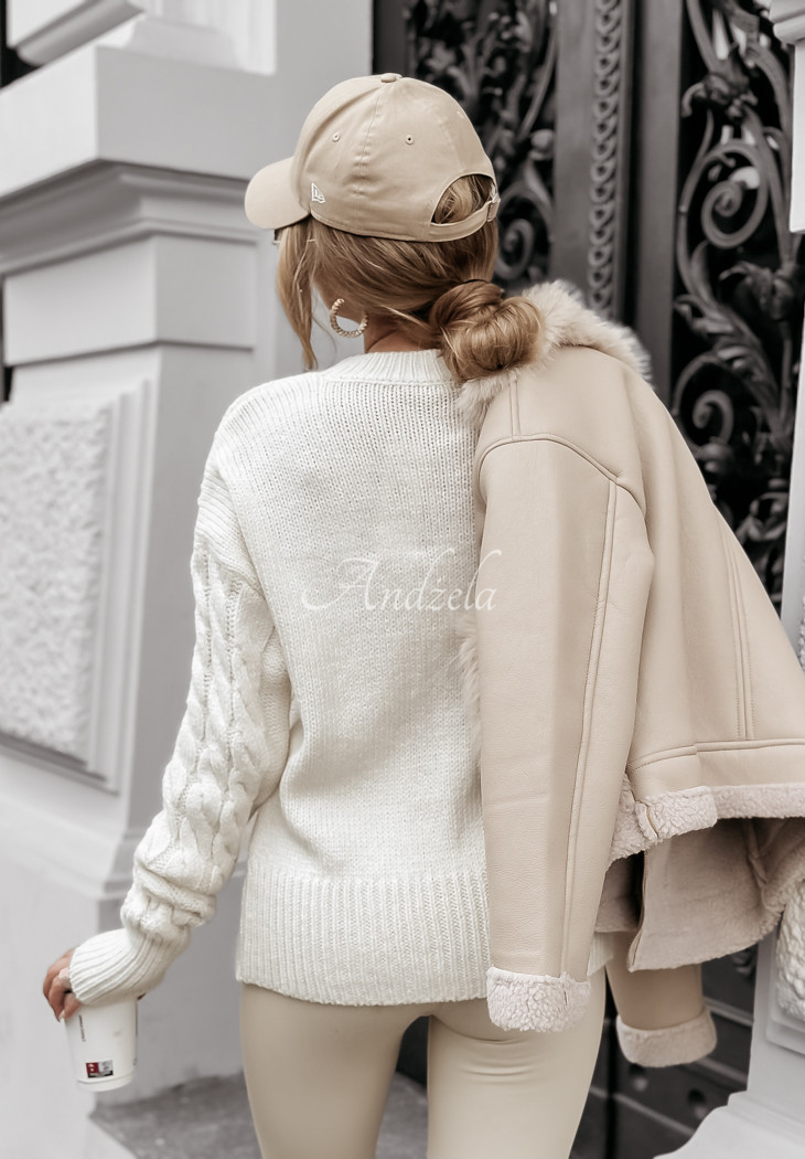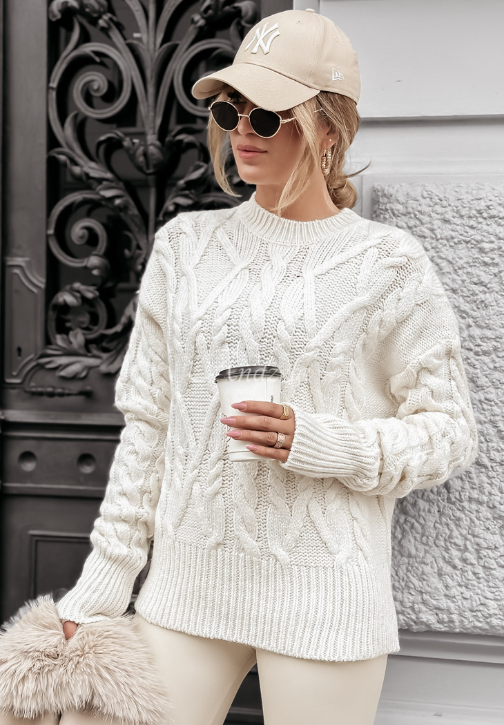 Der Pullover mit dekorativem Strickmuster ist eine perfekte Ergänzung für die Garderobe jeder Frau. Das Modell hat einen Rundhalsausschnitt und lange Ärmel, die, wie der Saum, mit Rippenbündchen abgeschlossen sind. Er ist die perfekte Basis für kältere Tage.