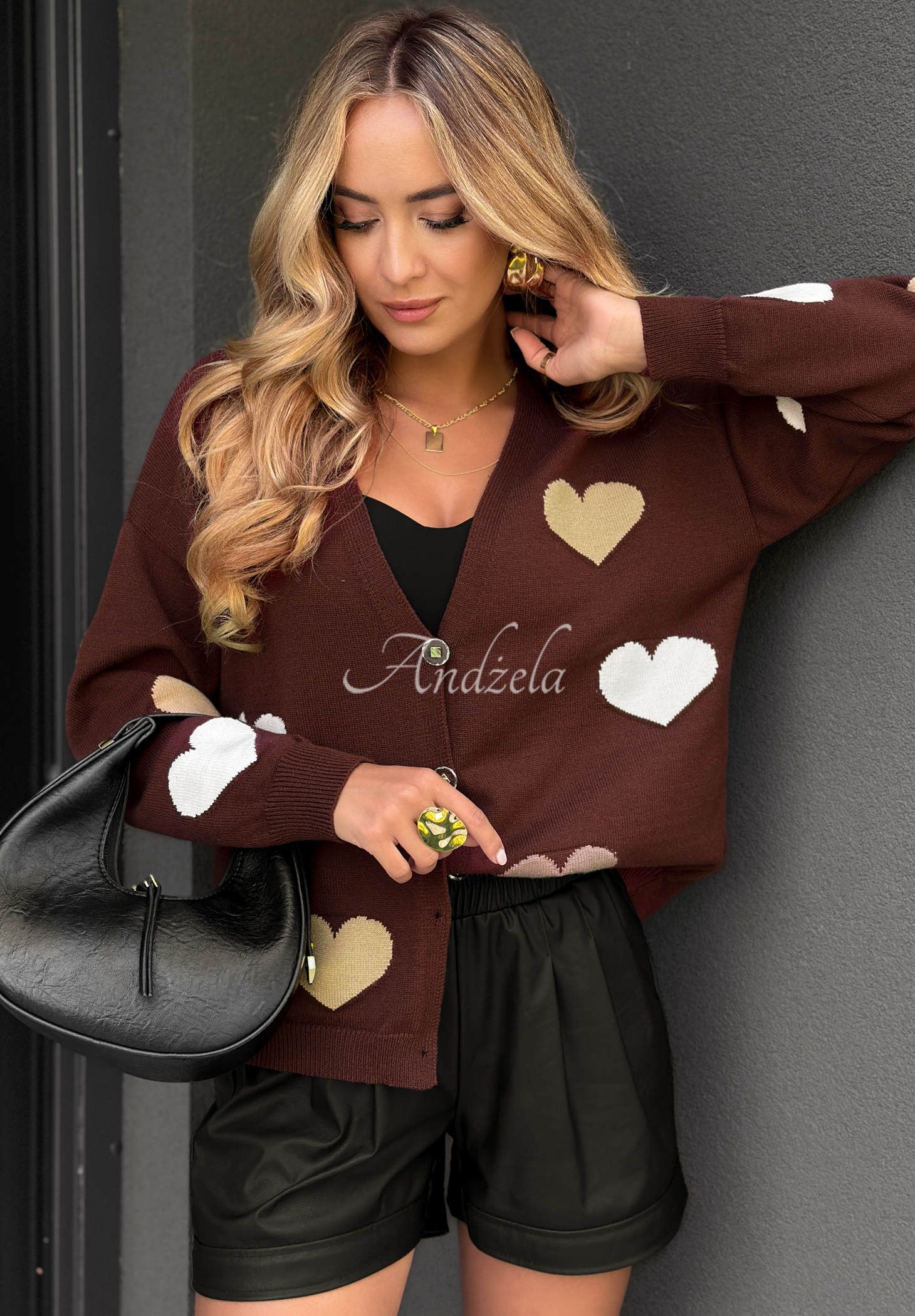 Eine kurze Strickjacke mit Herz-Print aus elastischem Material mit einem Hauch Viskose. Sie wird mit Knöpfen geschlossen und hat gerippte Bündchen und Saum.