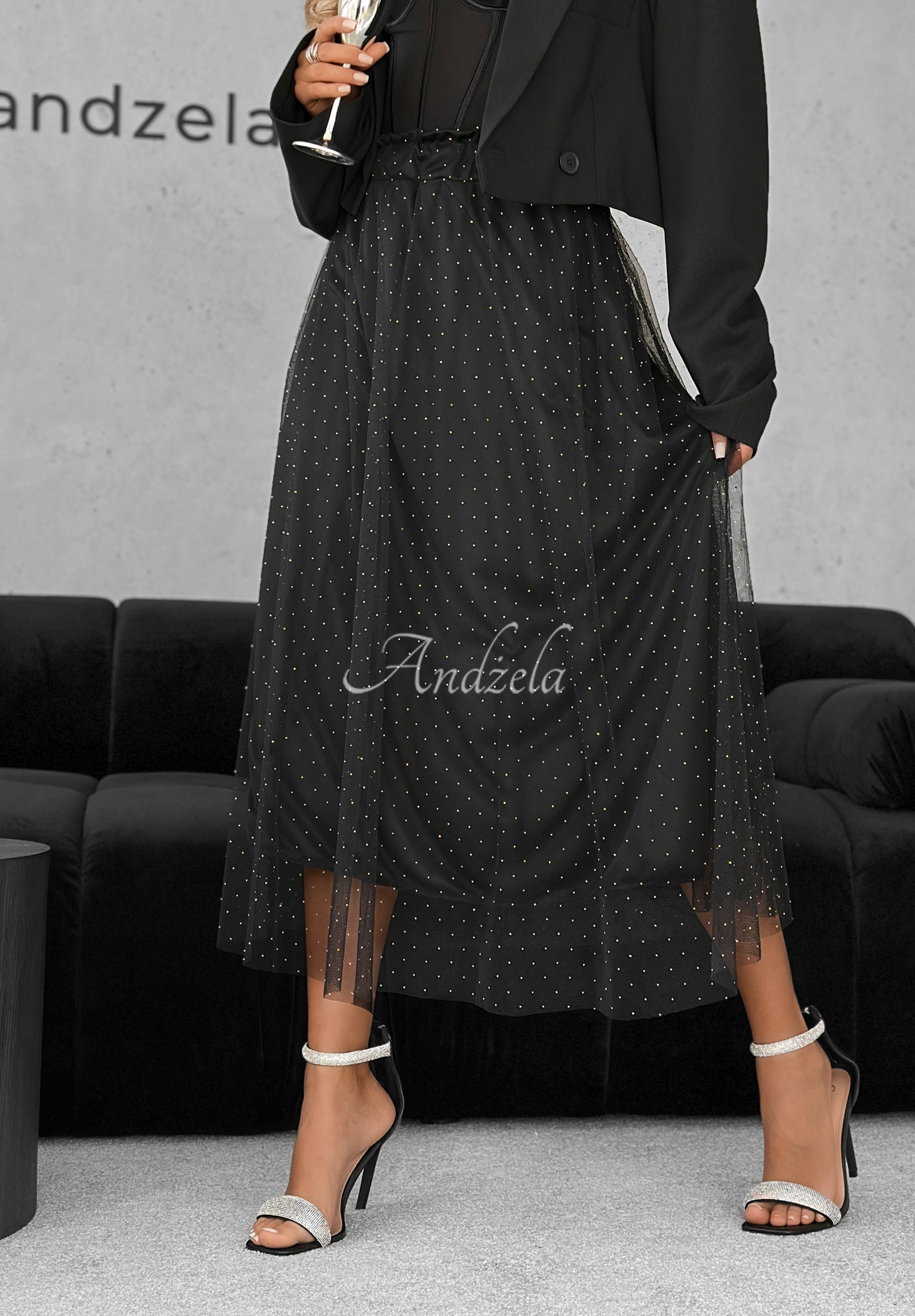 Ein einzigartiger Rock aus weichem Tüll. Er ist durchgehend mit kleinen, aufgeklebten Kristallen verziert. Dieses Modell ist gefüttert und verfügt über einen elastischen Bund.