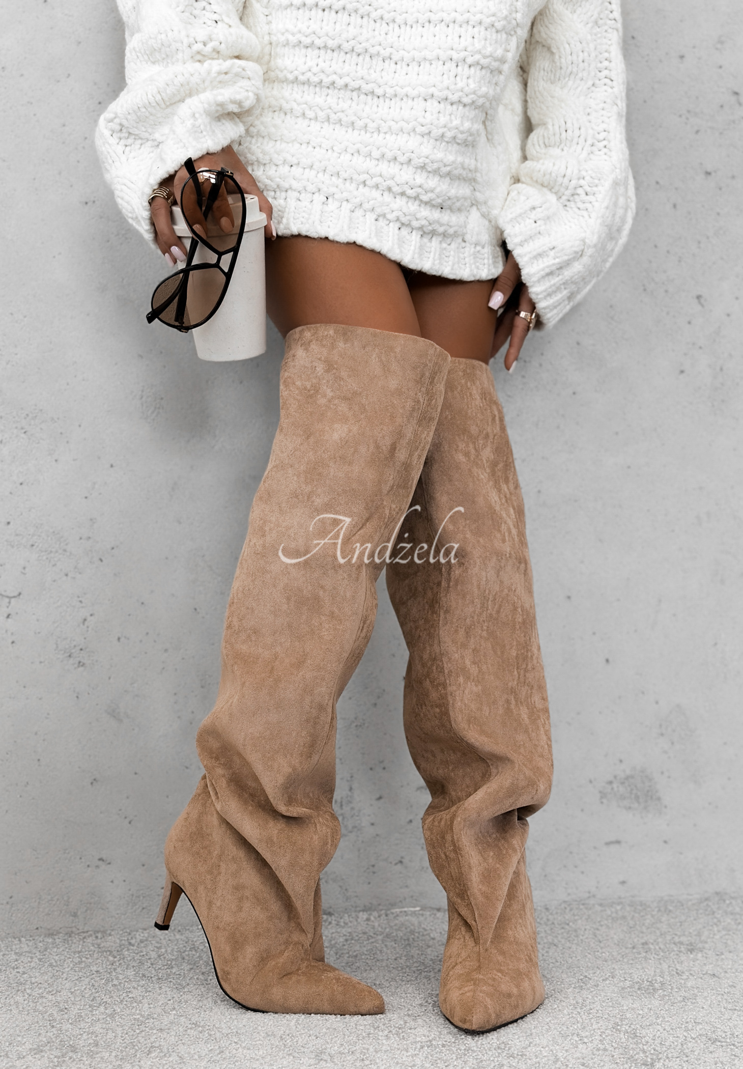 Lange Overknee-Stiefel aus weichem Wildleder. Dieses Modell zeichnet sich durch eine spitze Sohle und einen schmalen Stilettoabsatz aus. Sie sind ungefüttert.