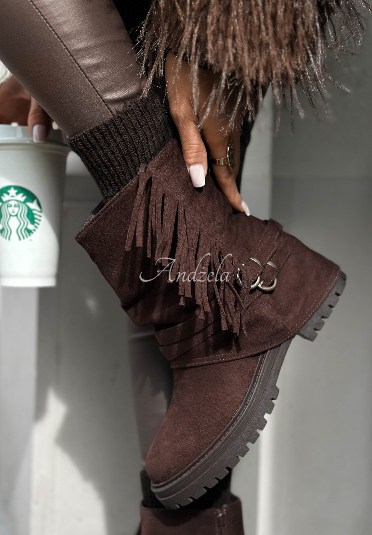 Diese Stiefeletten aus Wildlederimitat zeichnen sich durch zusätzliches Material, Fransen und Schnallen aus. Sie haben einen knöchelhohen Schaft und eine abgerundete Spitze. Der Verschluss erfolgt über einen inneren Reißverschluss.